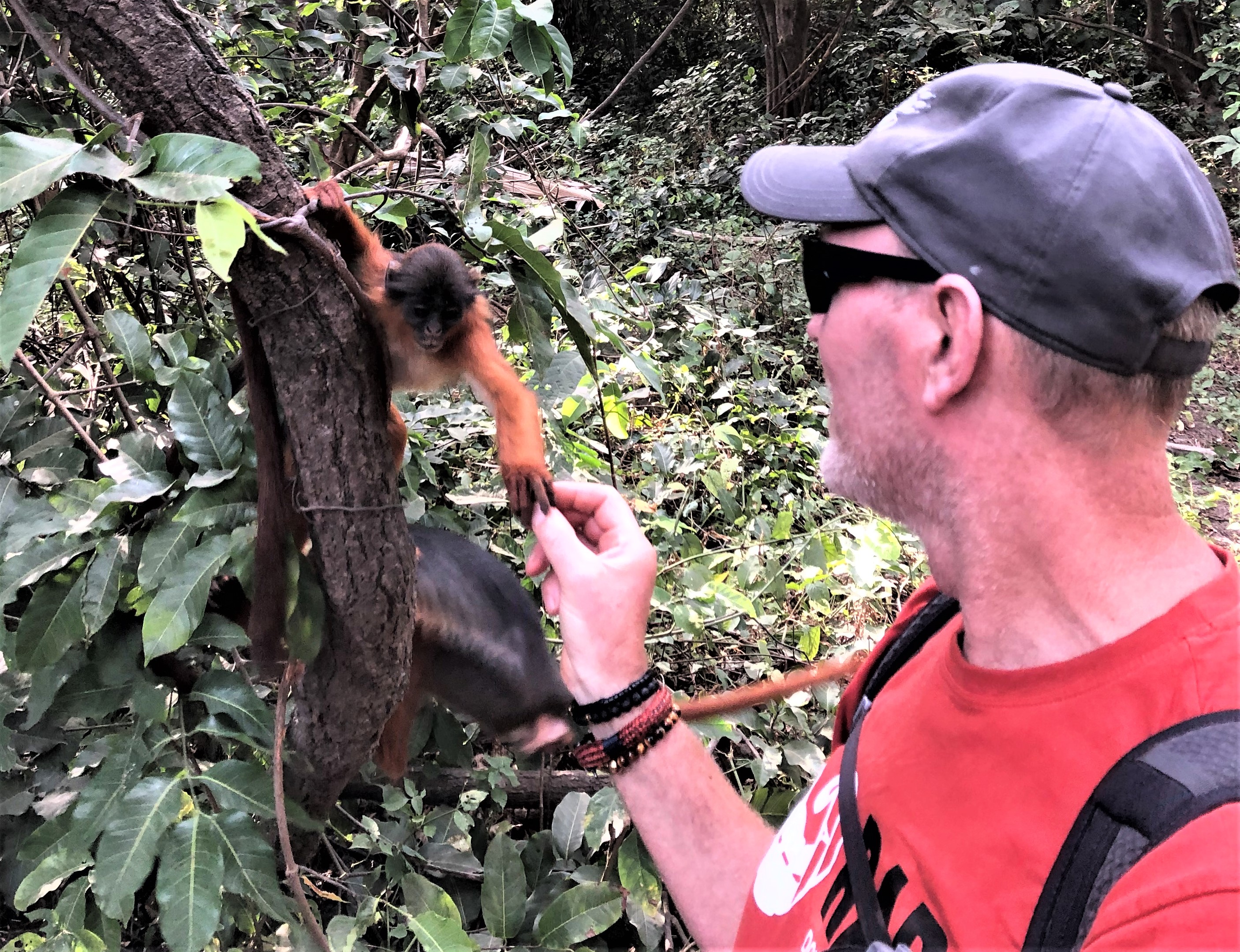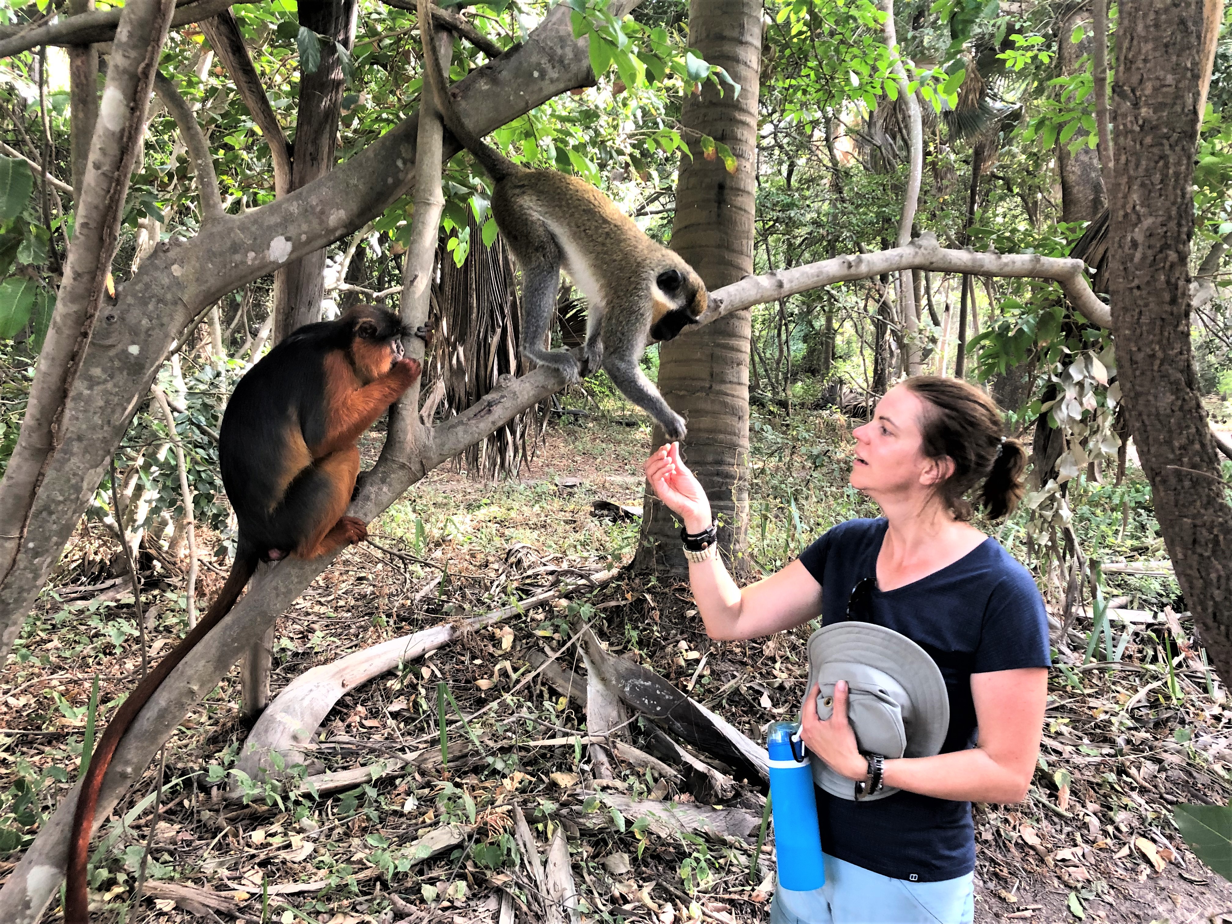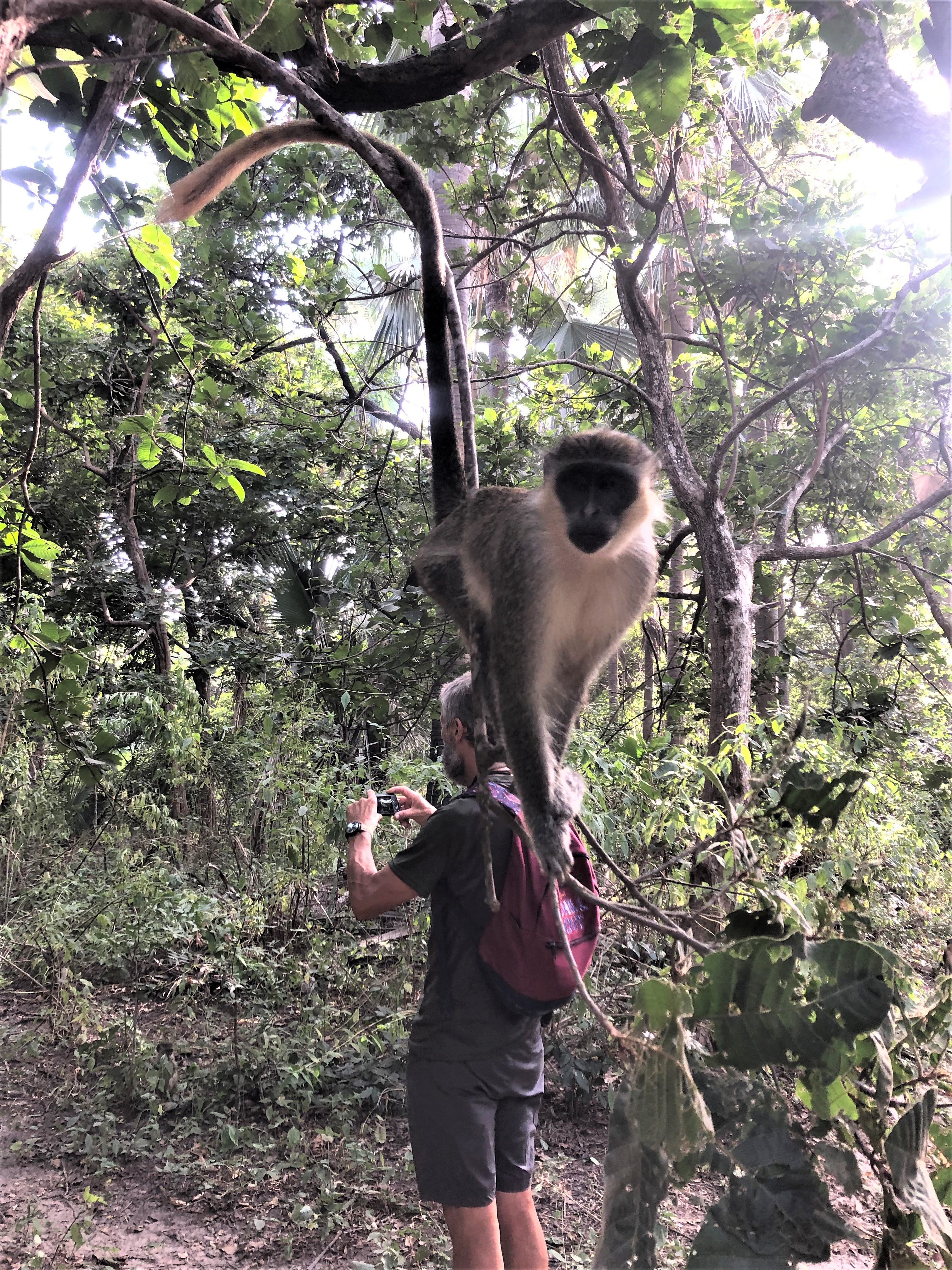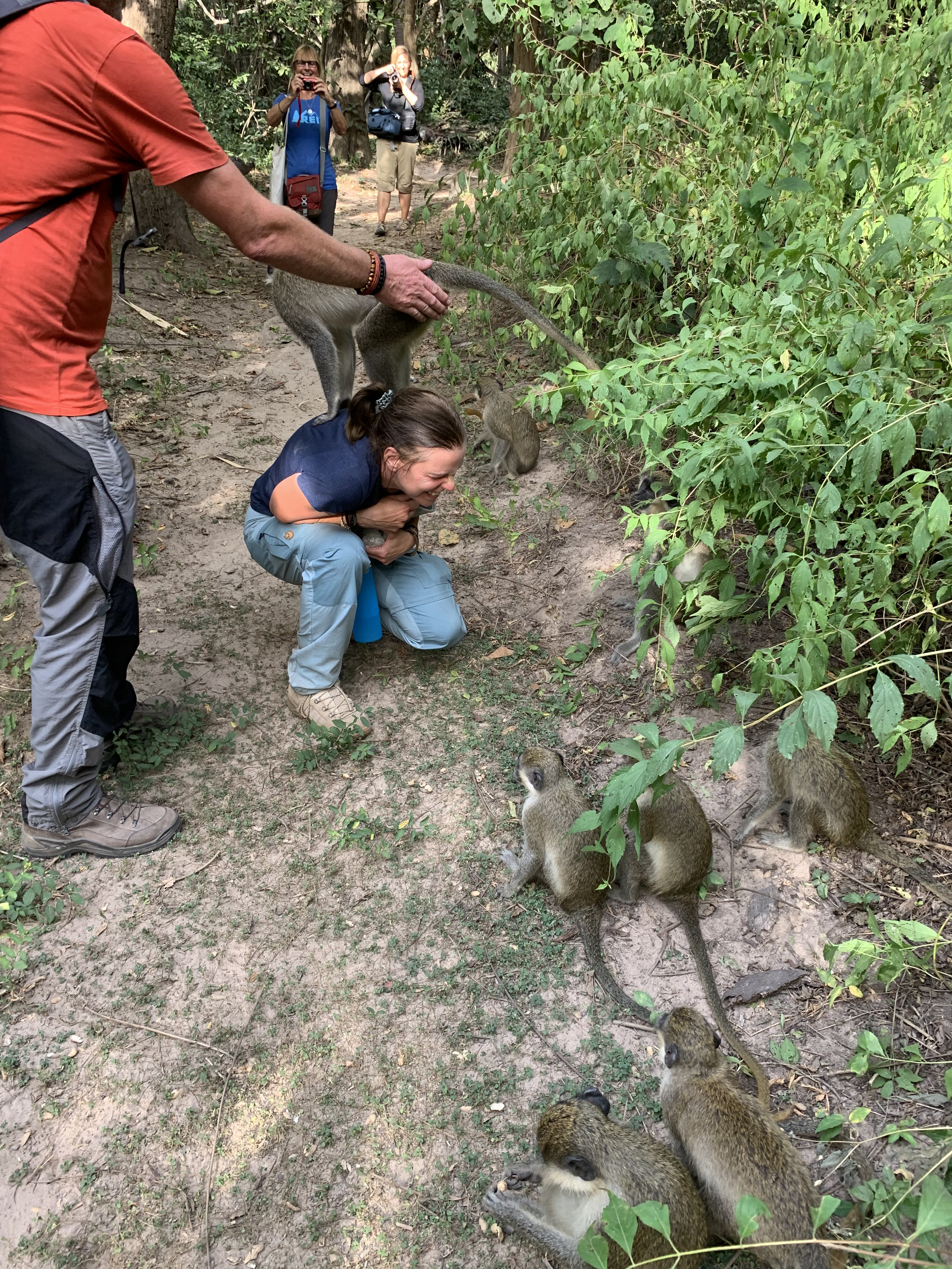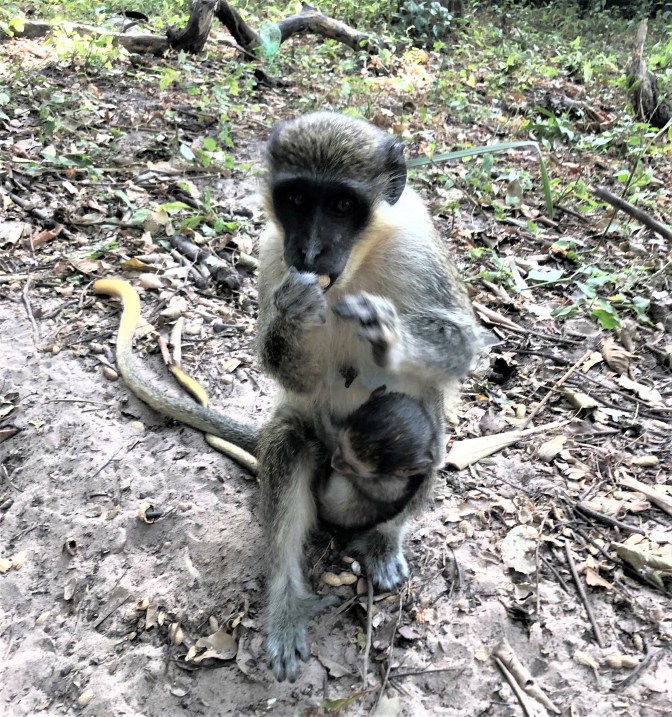 What an afternoon! Vervet and Red Colobus monkeys roamed the reserve in their hundreds. Along with the entrance ticket we were sold bags of peanuts – and the monkeys knew it! I have never met such well behaved monkeys in my life, famed for their aggression and noise these lovely little creatures came up and gently took the peanuts out of your hand. The more relaxed you were the more gentle they were, they even looked you in the eye whilst taking them as if to say thank you. There are always some that misbehave of course and a few of us ended up with monkeys on our shoulders, heads or backs – always gentle, no scratching or biting – and a couple ran up behind unexpecting tourists and snatched whole bags of nuts from hands or pockets!