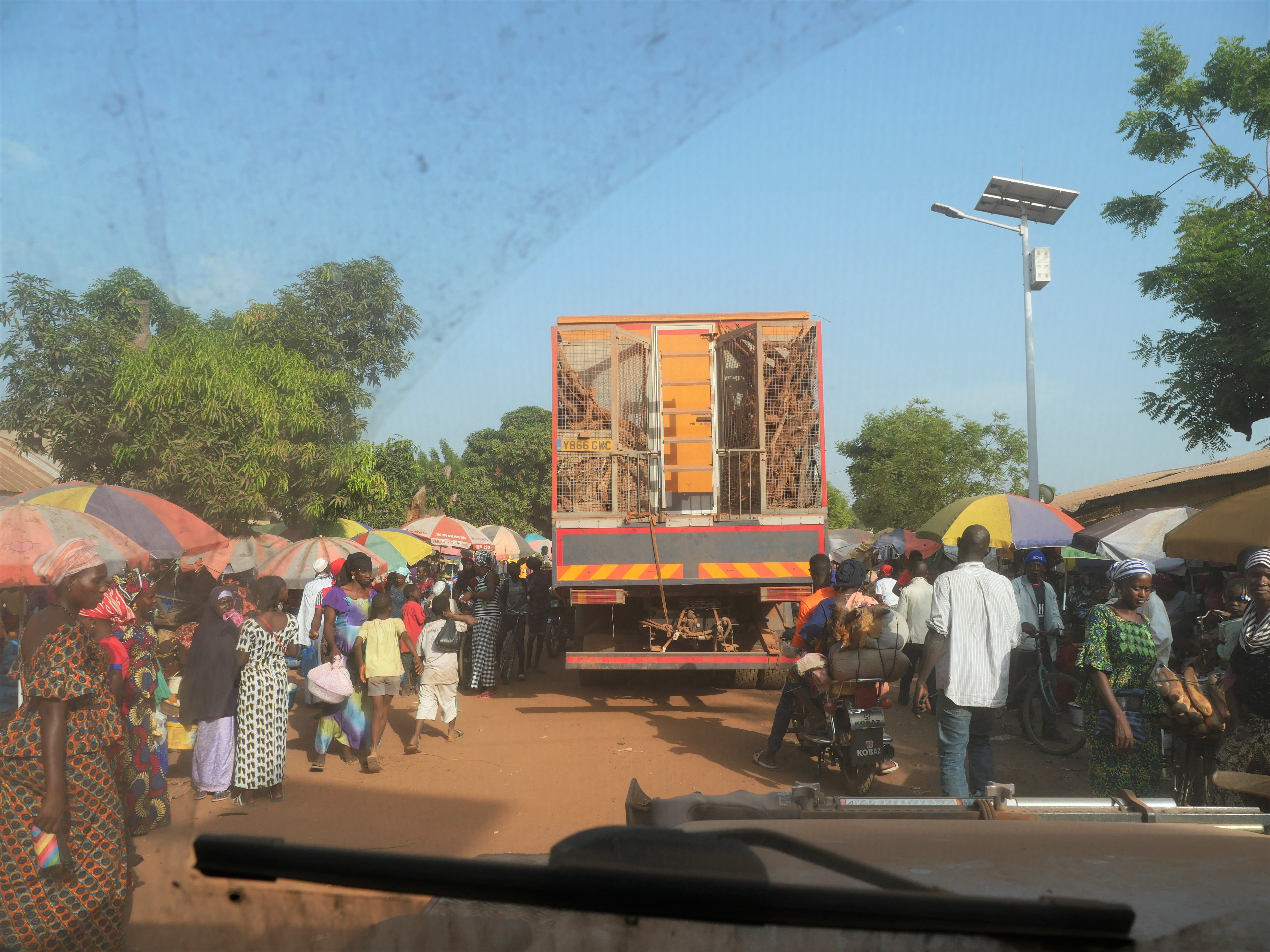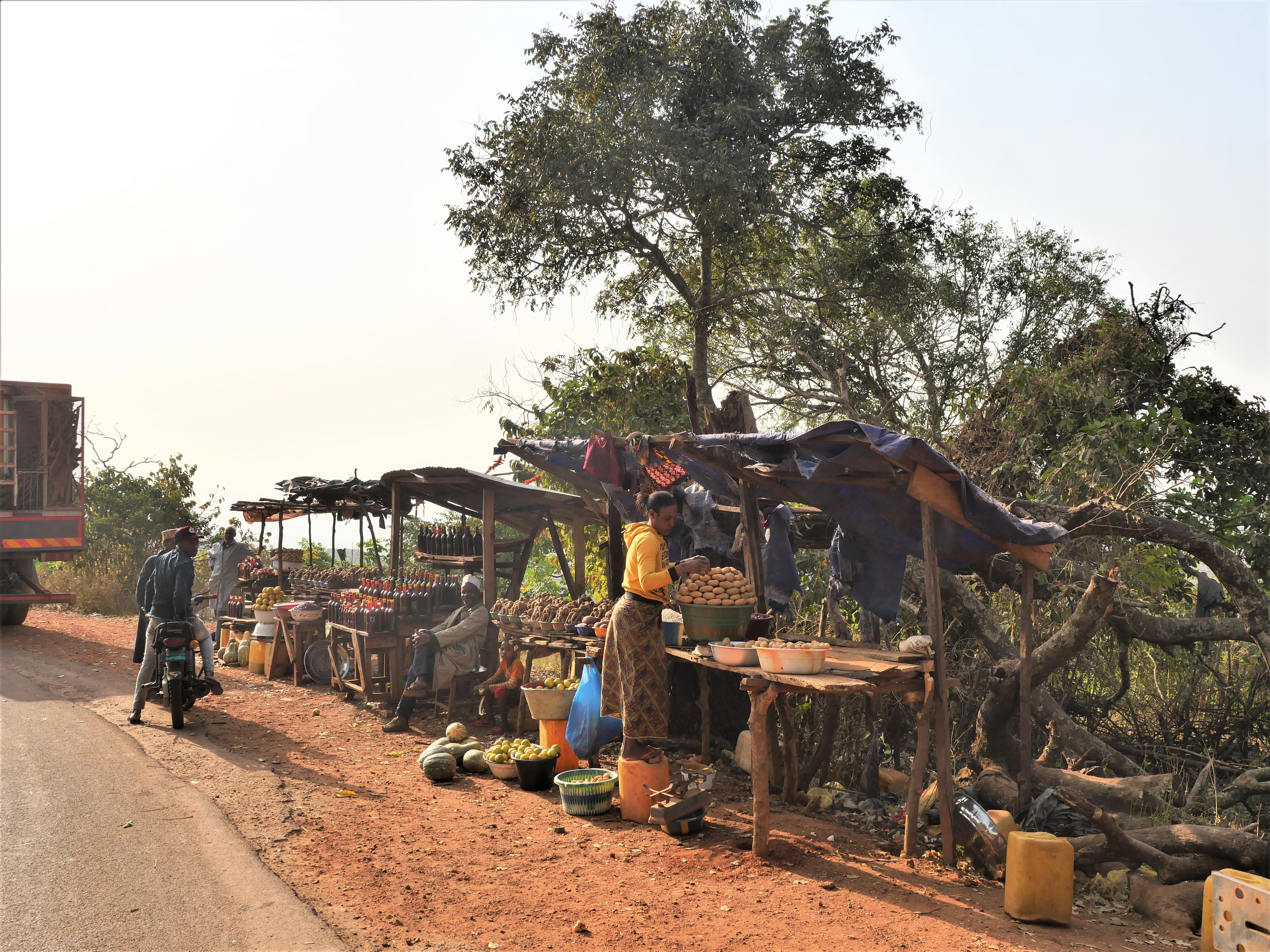 After a few hours of driving we strangely hit one of the best tarmac roads we had seen since leaving The Gambia! It didn´t last long but whilst we were on it we started to pass through numerous small towns. Each one appeared on the surface to be identical – a long road with shacks either side selling everything and nothing. Colourful, busy, chaotic.