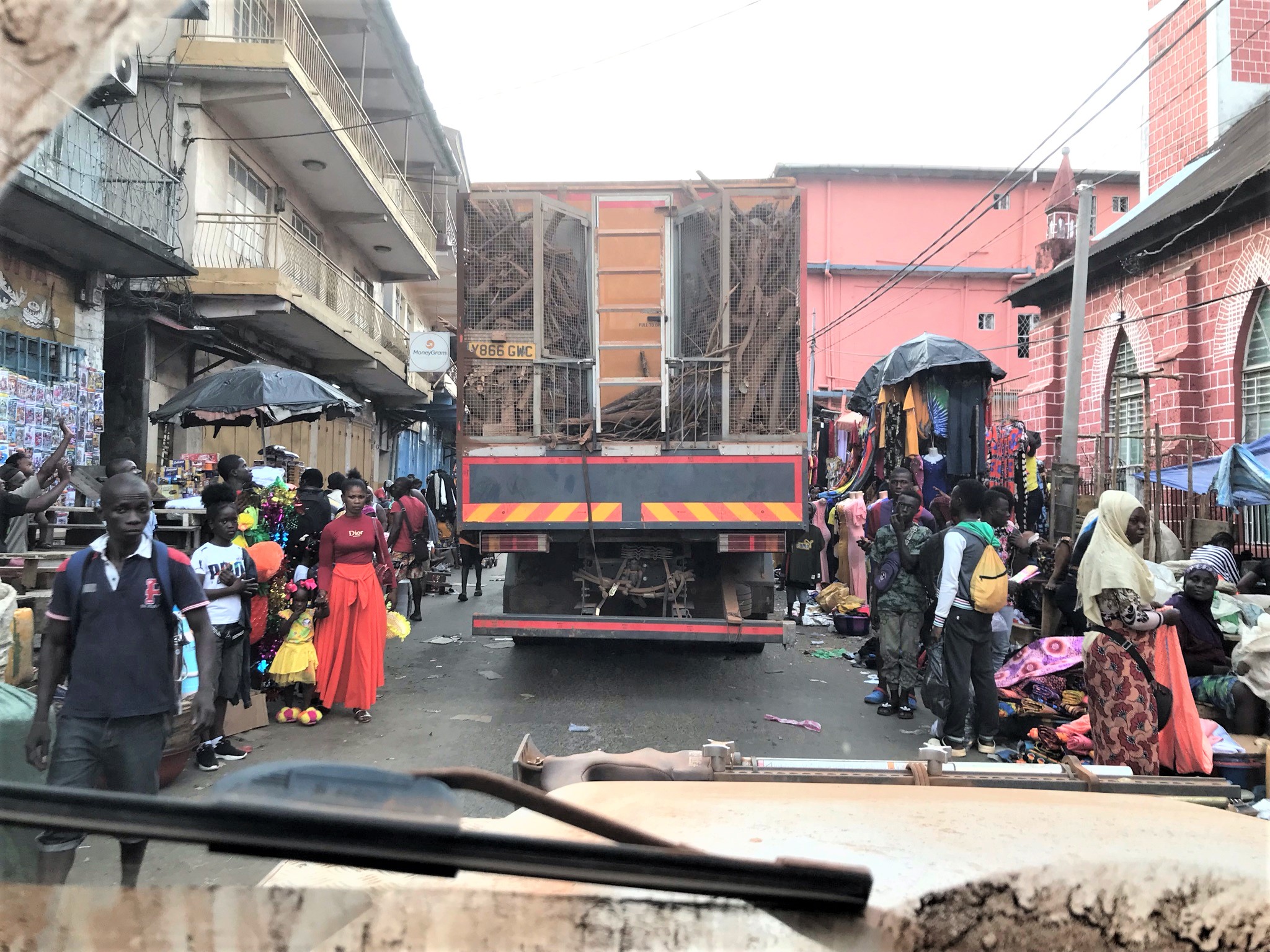 We walked out with a few others to try and find food and ended up in a bakingly hot fried chicken cafe. I was feeling ill from dehydration and feared our Freetown experience would indeed be another Dakar. Things went from bad to worse. As we arrived back at the YMCA the staff advised us to take everything off the outside of Henry as otherwise it would be gone by morning and the church opposite was having a very, very loud party which carried on until 5am – our room was shaking. Even if it had been quiet we wouldn´t have had a wink of sleep all night as we spent most of the time looking out of the window at Henry whilst cars pulled up, men walked round him, kids loited about. I was all for packing up and driving away – anywhere, any cost, at the end of the day Henry is our home and our life, if we lost him or he was damaged the cost of an expensive hotel with security would be small fry.