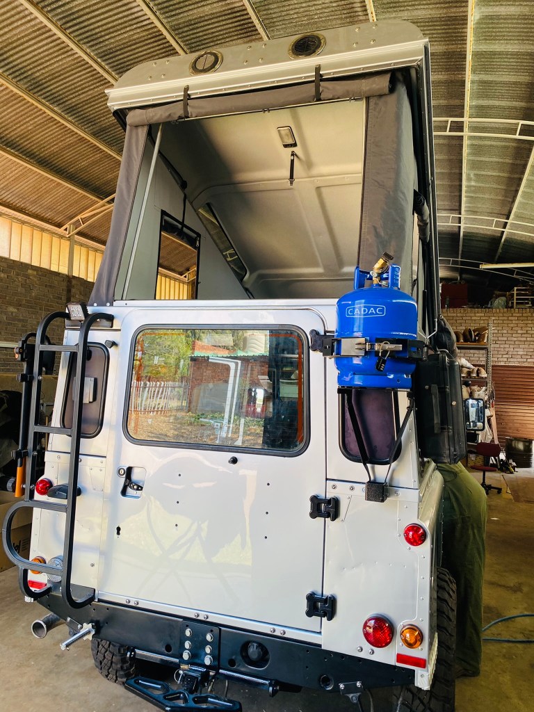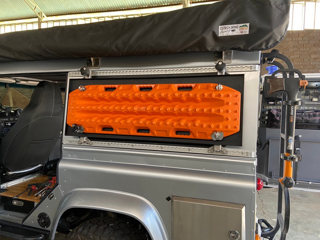 Improvement number four! The sand ladders were no longer going to be stored on the roof, they were now fixed to the side window – firstly to reduce weight on the roof but also now fixed on hinged brackets to drop down and create much-needed additional table space. Brilliant design, I get very excited about table space!