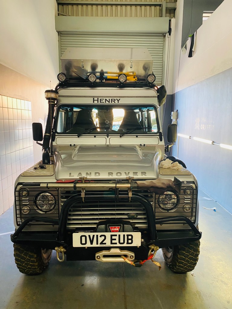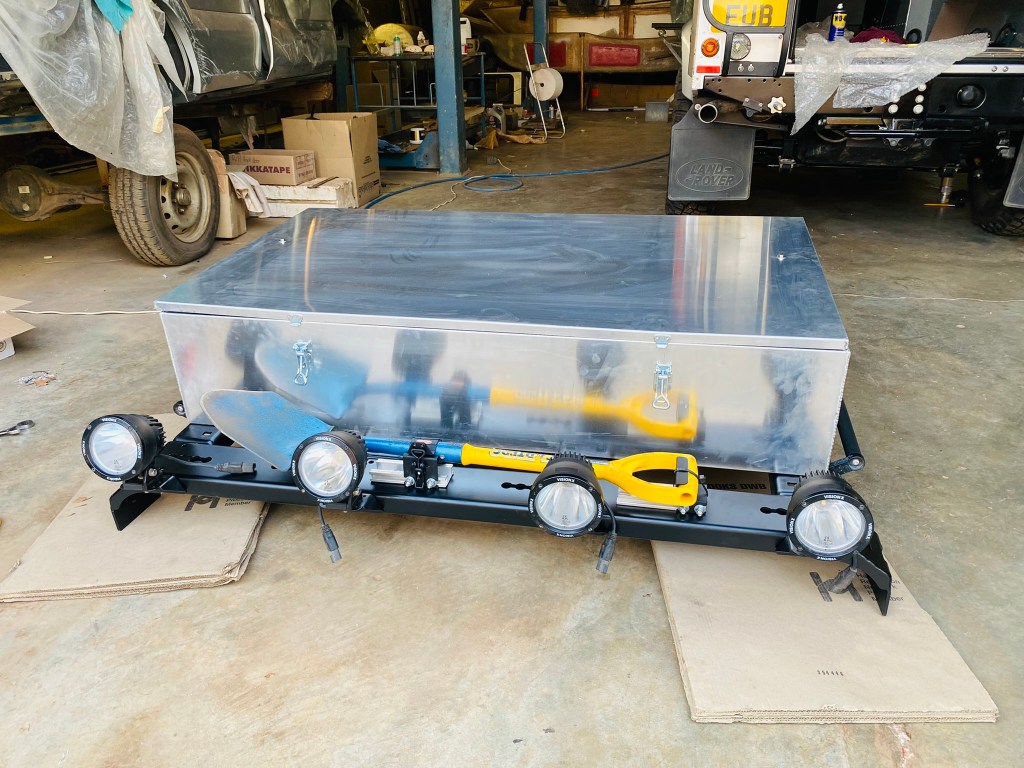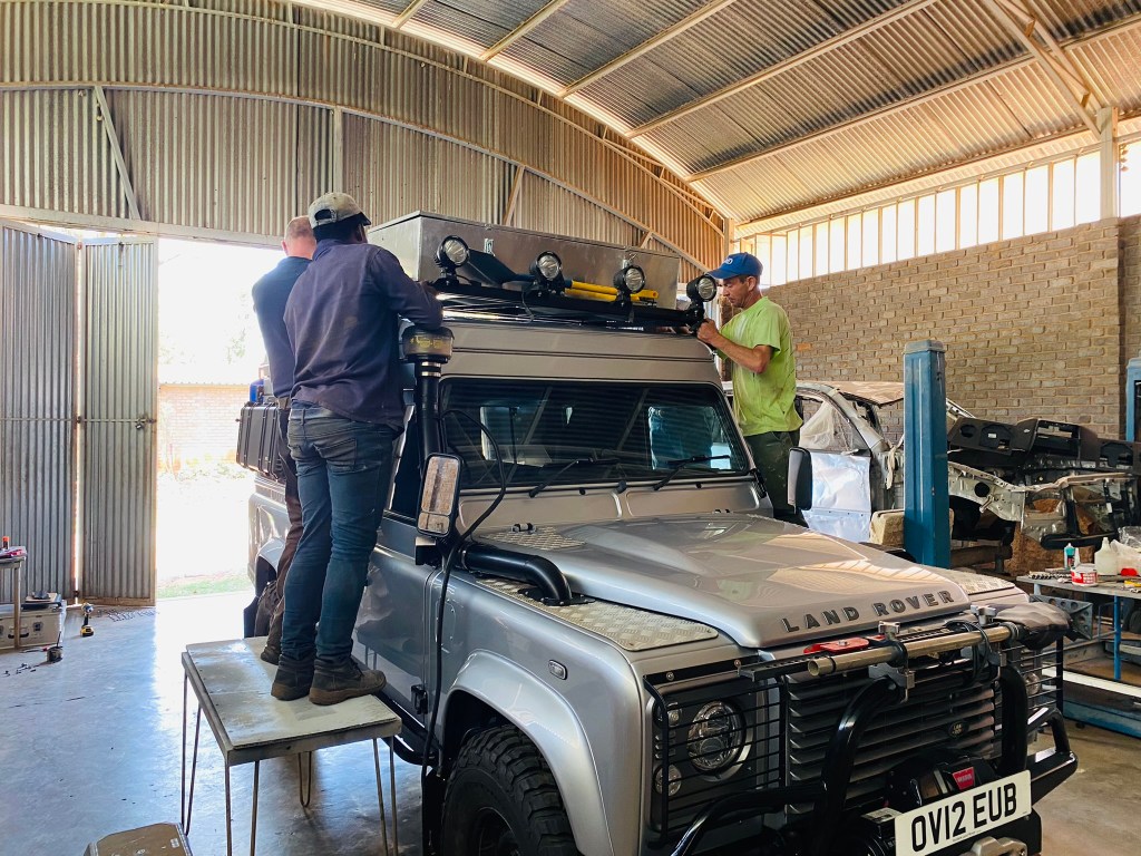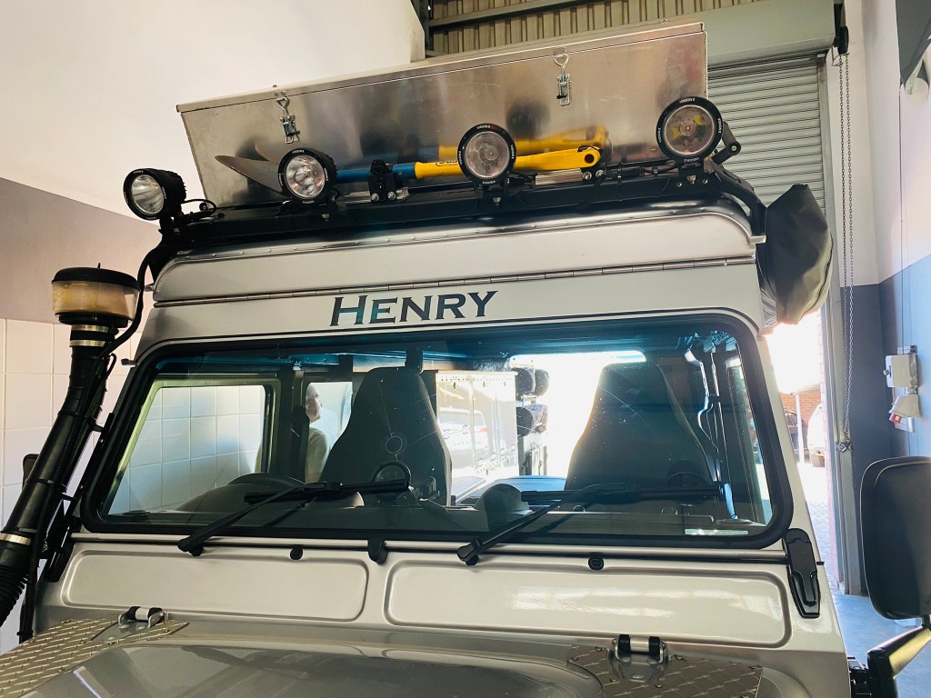 Felix and James spent a couple of hours rebuilding the recently straightened and re-sprayed roof rack with front spot lights, spade and the new roof box made by Big Country.