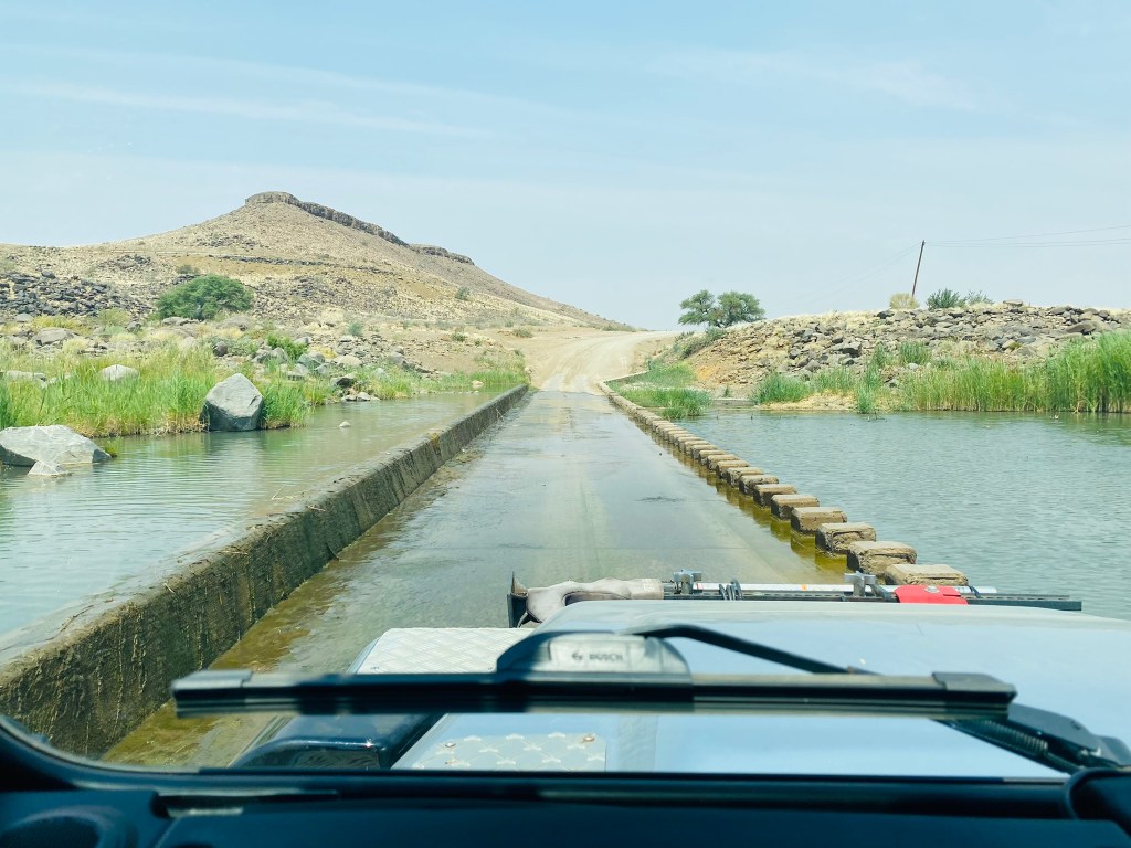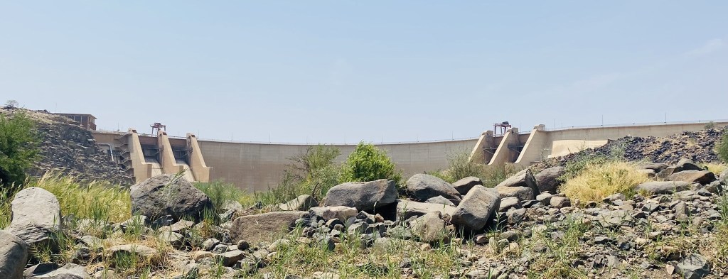 And it seemed incongruous when we crossed a stream flowing out of the dam – a brief respite from the sweltering heat and dust whilst Henry cooled his feet!