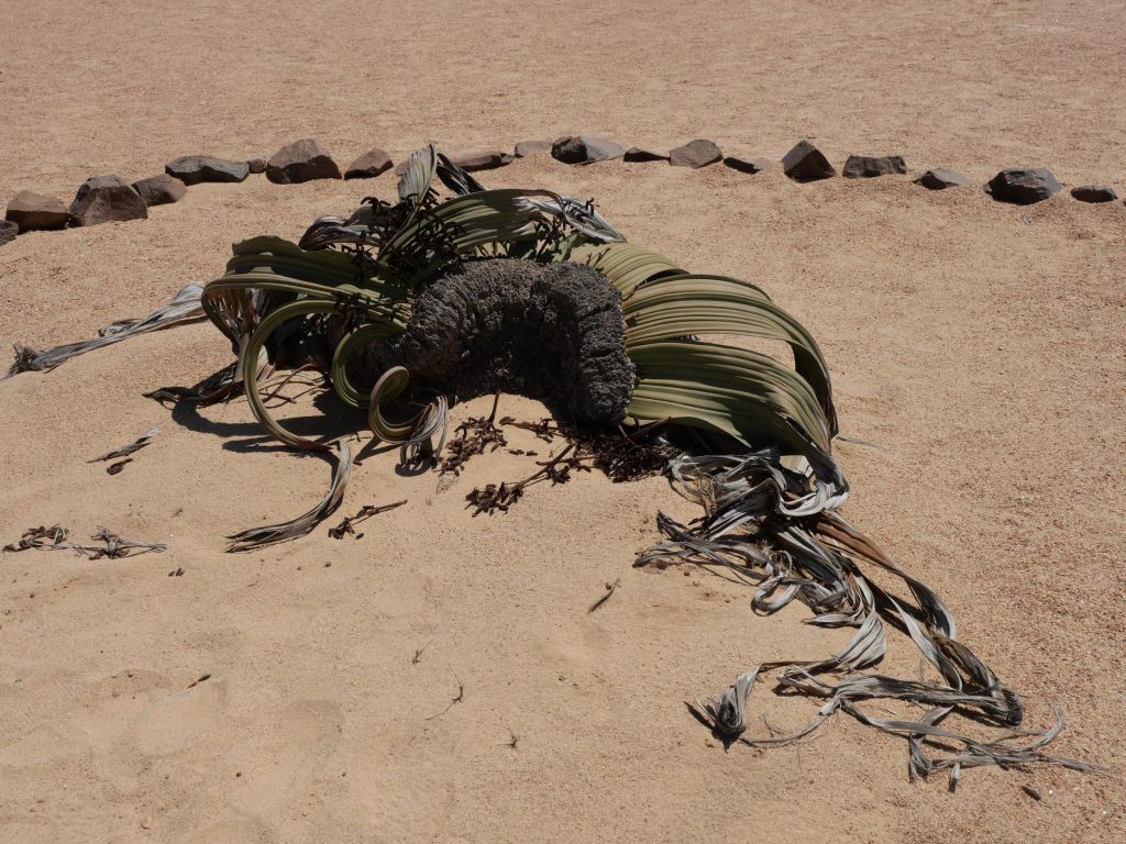 Its full name is Welwitschia Mirabilis – Miraculous (or Amazing) Welwitschia. They live only in the Namib Desert and soak up water from fog and dew. The oldest known individual is 5,000 years old, many are over 1,000 years old. They symbolise longevity and survival against all the odds.