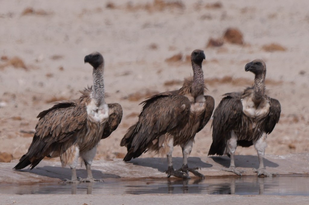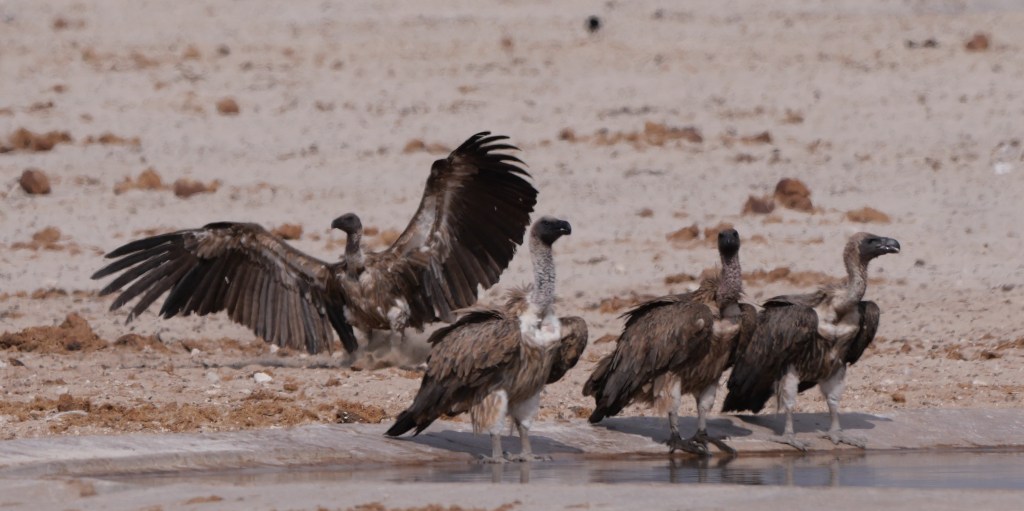 At one watering hole we watched as a group of vultures swooped in for a drink. All very peaceful at first with everyone lining up to drink