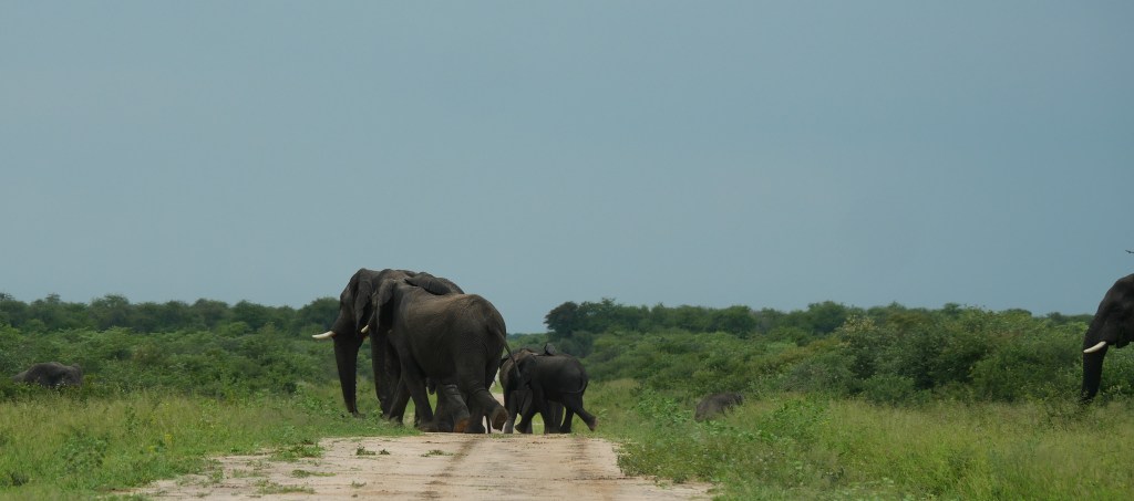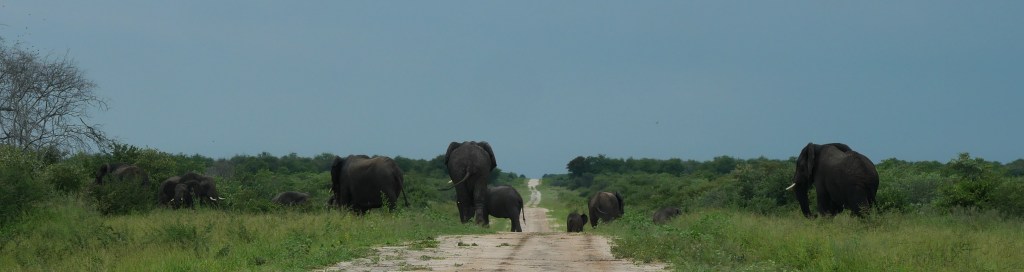 Ironically, on the road back, a few miles out of the Park, we were stopped in our tracks twice by huge herds of elephants wandering along the road.