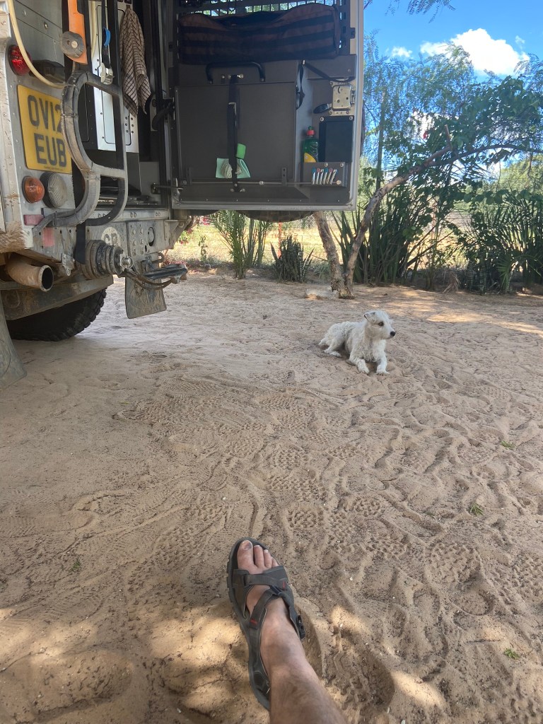 So with all this going on in the background, we entered Botswana with ease at the border and decided to camp up early to allow James to rest his foot and his stomach. The campsite at the Namibian border had recommended a similar campsite an hour into Botswana and we gratefully pulled up there in the early afternoon. It was fine, the owner was extremely friendly and she sold us wood and chicken. But it was a little run down and, like the campsite the previous night, was right on a busy main tar road. I was very surprised to find a tar road in Botswana from my previous recollection of the country and we were both a bit down having to spend the evening listening to heavy lorries and cars zooming past all night.
