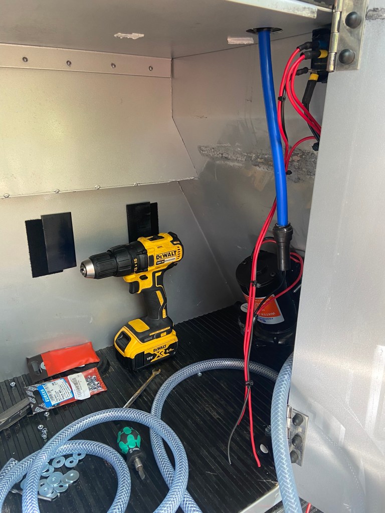 All the next day James worked on wiring, plumbing, fixing the large and heavy pump to the inside of the water cupboard.