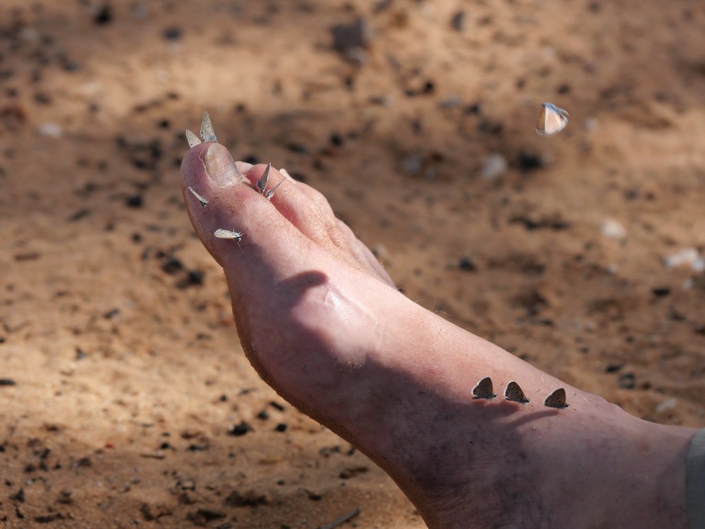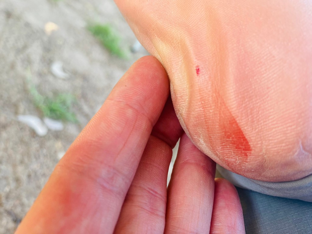 The campsite was also covered in large thorns, fallen from the trees above. At one point, in my flip flops, I trod down hard on one and joined James with a very sore foot for the next few hours.