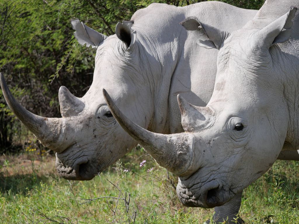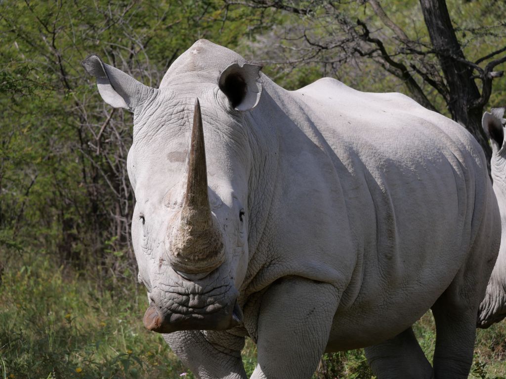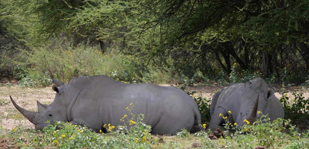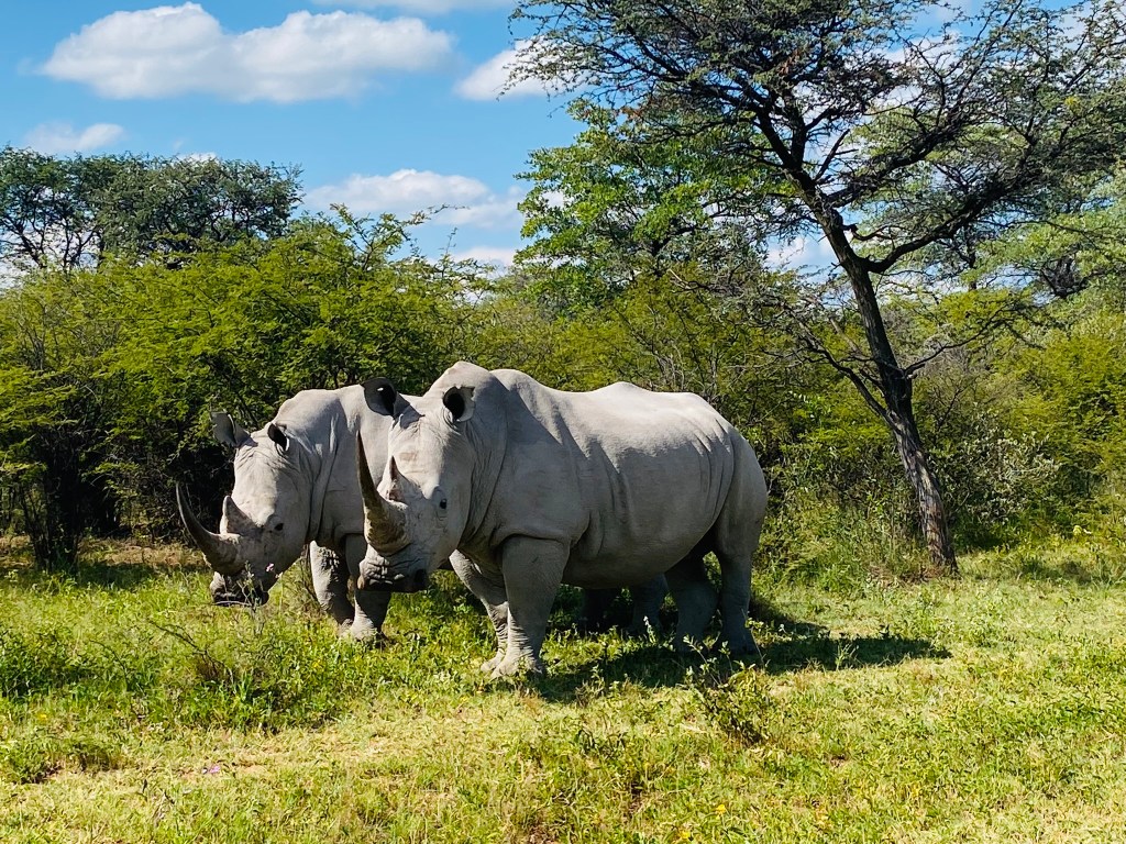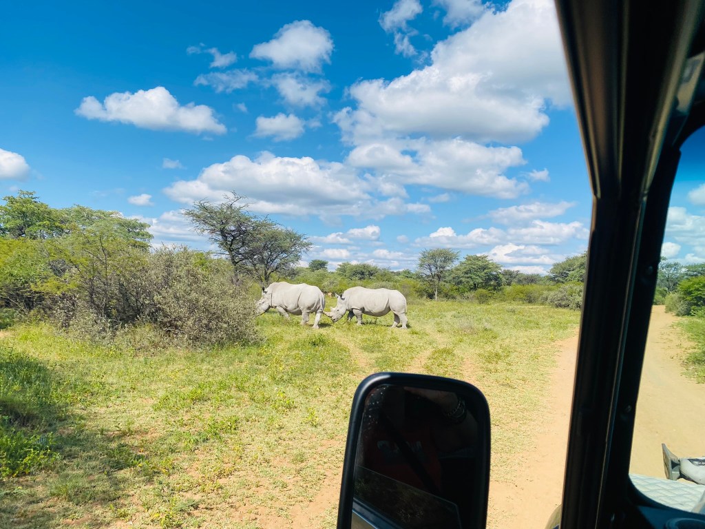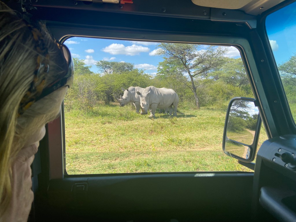 As we slowly drove over the trails we rounded a corner and came face to face with two huge Rhino standing right in front of us