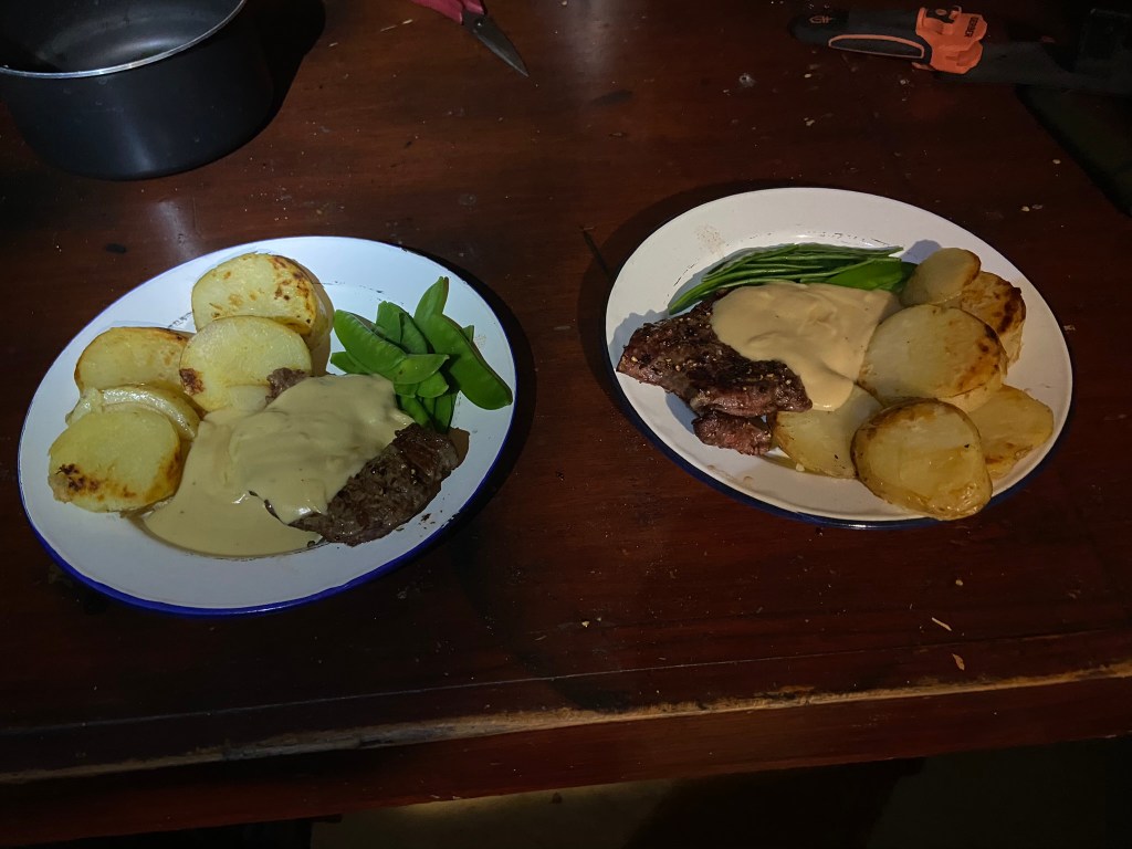 That evening we took advantage of the large campsite table and benches to cook a surprisingly successful dinner of steak and chips on the braai!