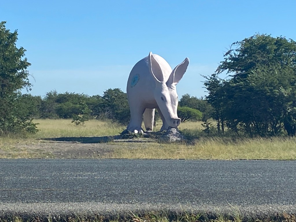 But we made it in one piece and were pleased to find our chosen campsite was clean, spacious and had lovely, clean water including wonderful hot showers – a real treat after five days in the Kalahari. Not to mention an enormous, pink Aardvark guarding the entrance
