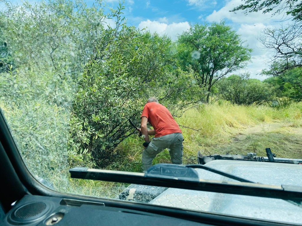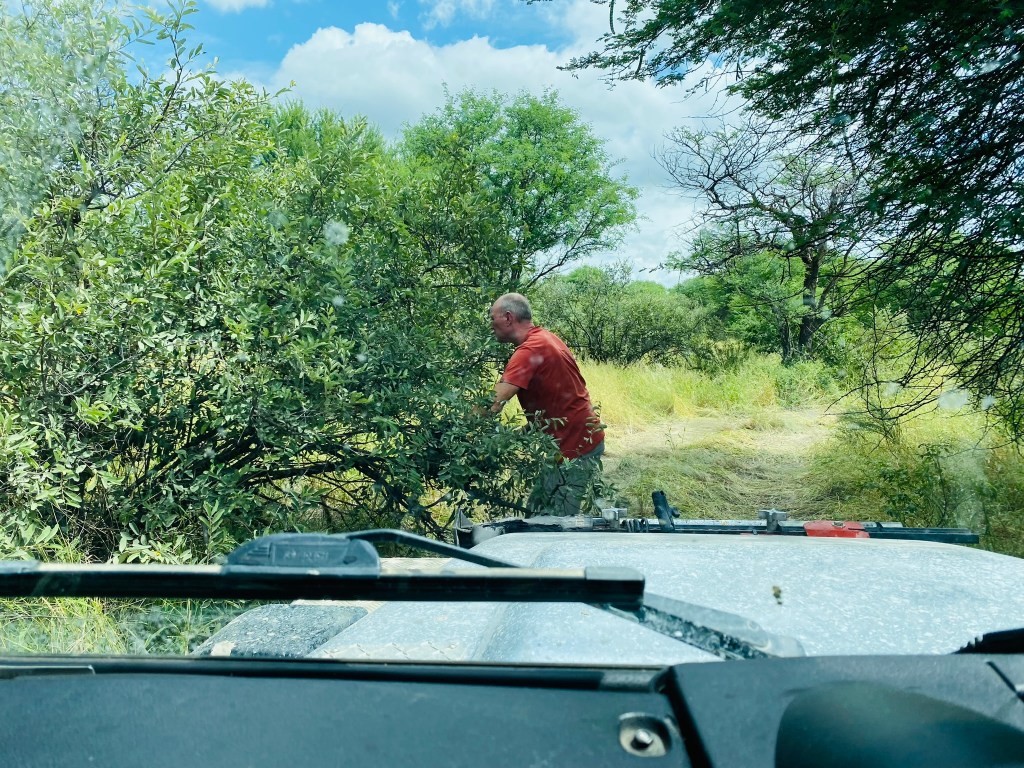 So far we had enjoyed some lovely views and appreciated the remoteness and tranquility of the campsites. But we had seen very few animals and been worried for Henry with the dense vegetation all round. James had been kept busy with the machete trying to clear a path through the thick, thorny scrub whilst I maintained lion-watch standing on the rock sliders