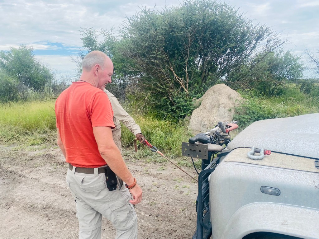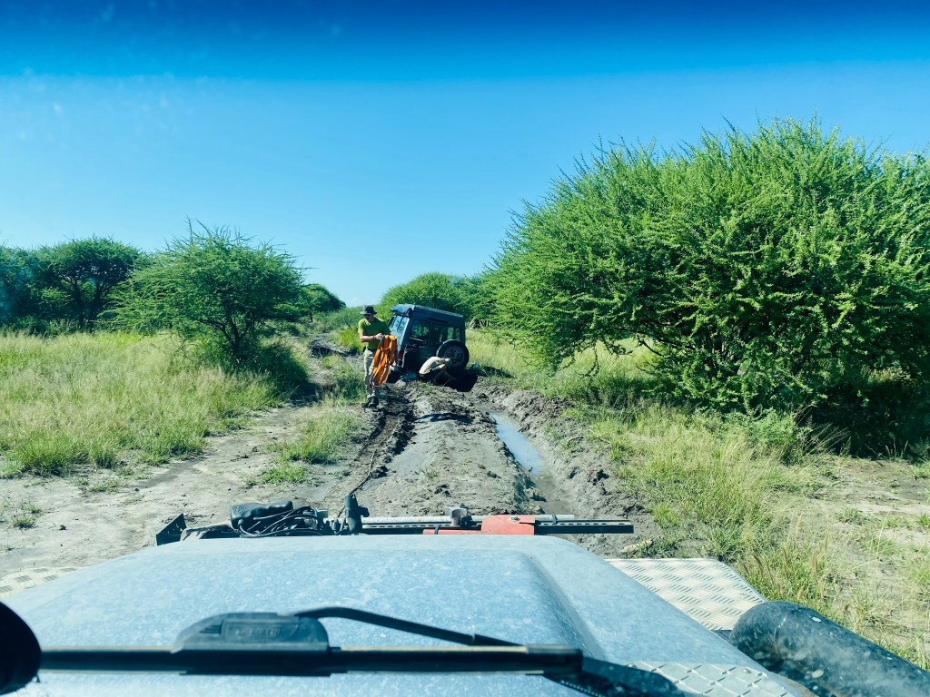 As we approached one watering hole we came across a Landcruiser stuck fast in the mud. I had to laugh, there is always fierce competition between Landcruisers and Landrovers so we had big grins on our faces as we offered to winch them out – especially as they were rangers from one of the lodges based in the safari capital of Maun!