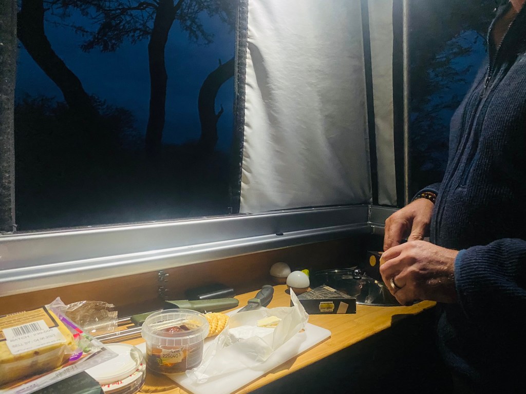 With disappointed looks on our faces we eventually gave up and sat down on the benches inside Henry to enjoy a far less nutritious dinner than planned – crackers and cheese with a breakfast bar and apple each! I may have been excited to see the lions but even I wasn´t about to go back outside and stand in the dark cooking tonight!