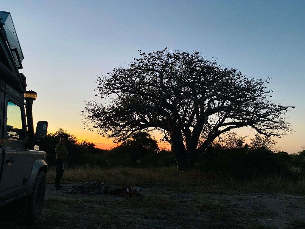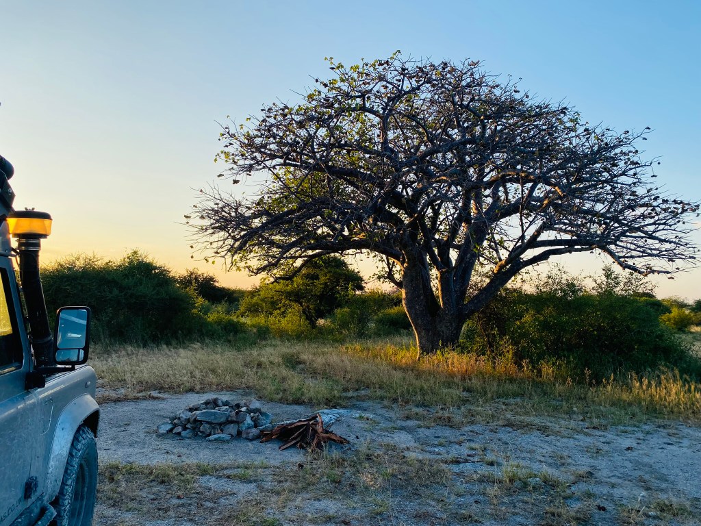 Once at the entrance gate we showed our paperwork, bought wood (getting my first wasp sting in the process, right in my hair, ouch!) and headed to our first campsite. The roads inside the Park were no better than the road from Rakops, if anything they were worse. It took us 3 hours to drive 56km but when we arrived, just as the sun was setting, we were very happy – the campsites here are very large and there is anything from 1km to 20km between you and your nearest neighbour
