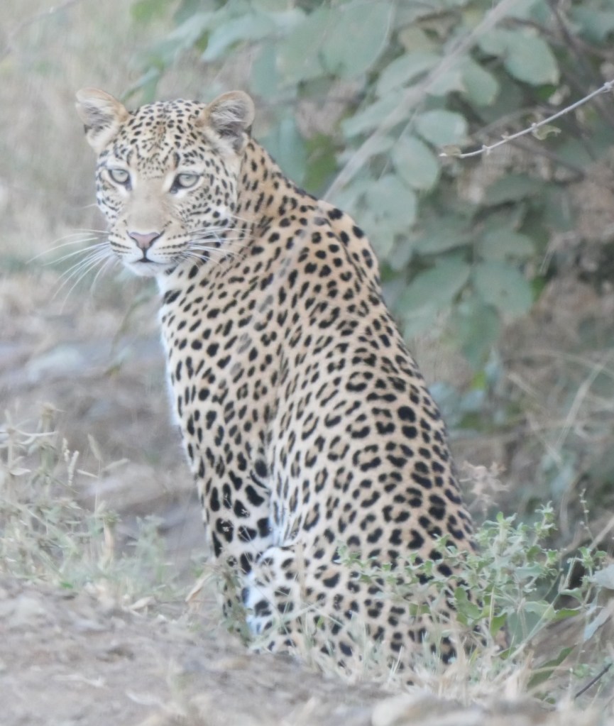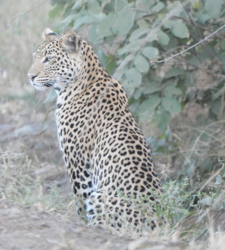 We had only just started off when two guide vehicles stopped in front of us. They were looking into the bushes with binoculars. We strained our eyes to see what they had found then suddenly a spotted paw appeared out of the trees followed by the rest of the beautiful cat. Our Botswanan Leopard sat and posed for his photos for a few minutes