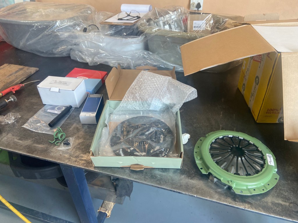 On Friday we had confirmation that the clutch was built and on it´s way to the airport. We also had confirmation that the gearbox was with the courier in South Africa – all as planned. So we took deep breaths, drove Henry to Ollie´s workshop via the hire car company and work started dismantling his insides