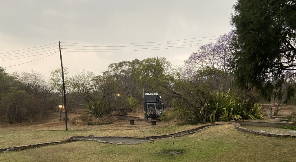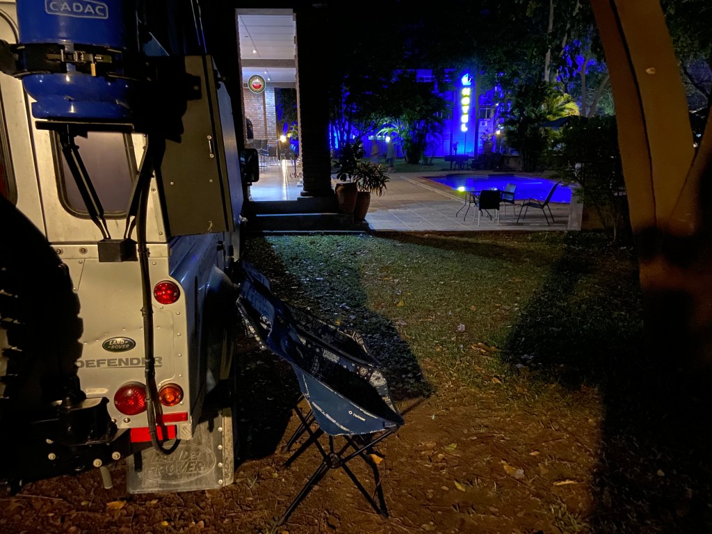 We arrived at Victoria Falls town by mid afternoon and it seemed cleaner, friendlier and far less desolate than when we had done our day trip there from Botswana back in 2018. I had found a hotel in the middle of town that had a campsite with good reviews and when we pulled up it was quite surprisingly smart. The campsite itself was crammed in around the hotel´s garden but it was safe and clean. There was a swimming pool and a bar serving amazing Chinese food so we piled into wonderful spring roles, stir fried rice and chinese chicken