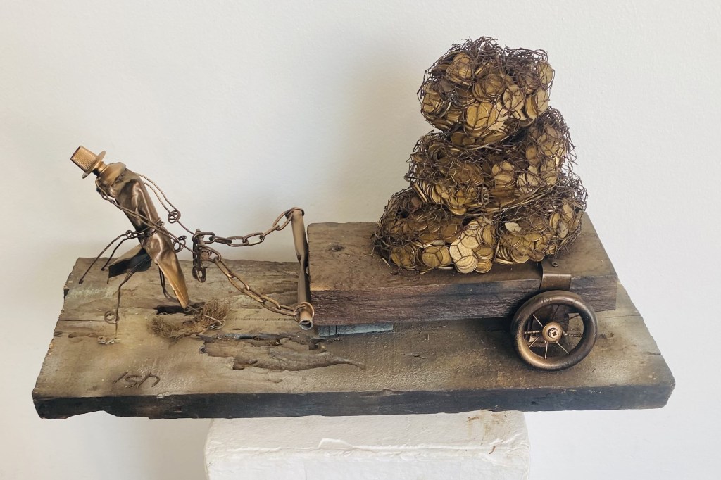 But by far the best bit was an exhibition by an artist who uses found materials to make astute comments on modern life