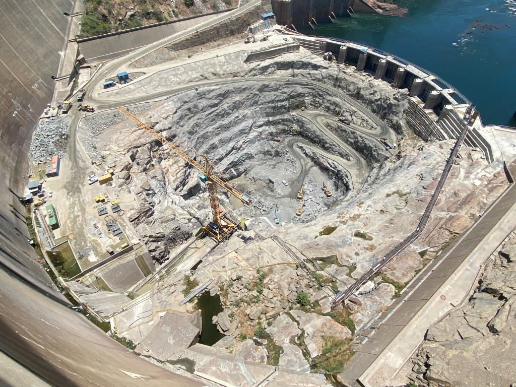 There is a huge three year project underway to rehabilitate the base of the dam which has been worn away over time and is undermining the whole structure. A huge barrier has been built to drain the water away and allow the massive construction project to take place