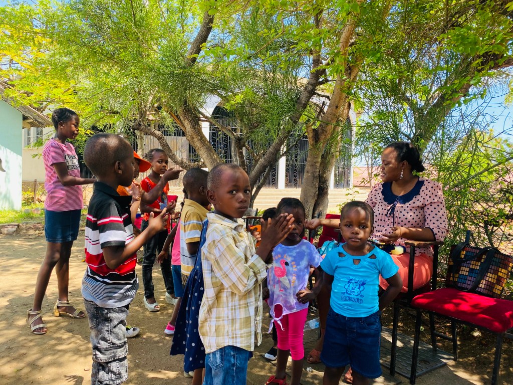 Whilst the grown ups were celebrating their faith the children were kept entertained outside singing memory songs, each taking it in turns to sing a line from the bible. They were having a great time singing with abandon until we showed up at which point nerves got the better of them.