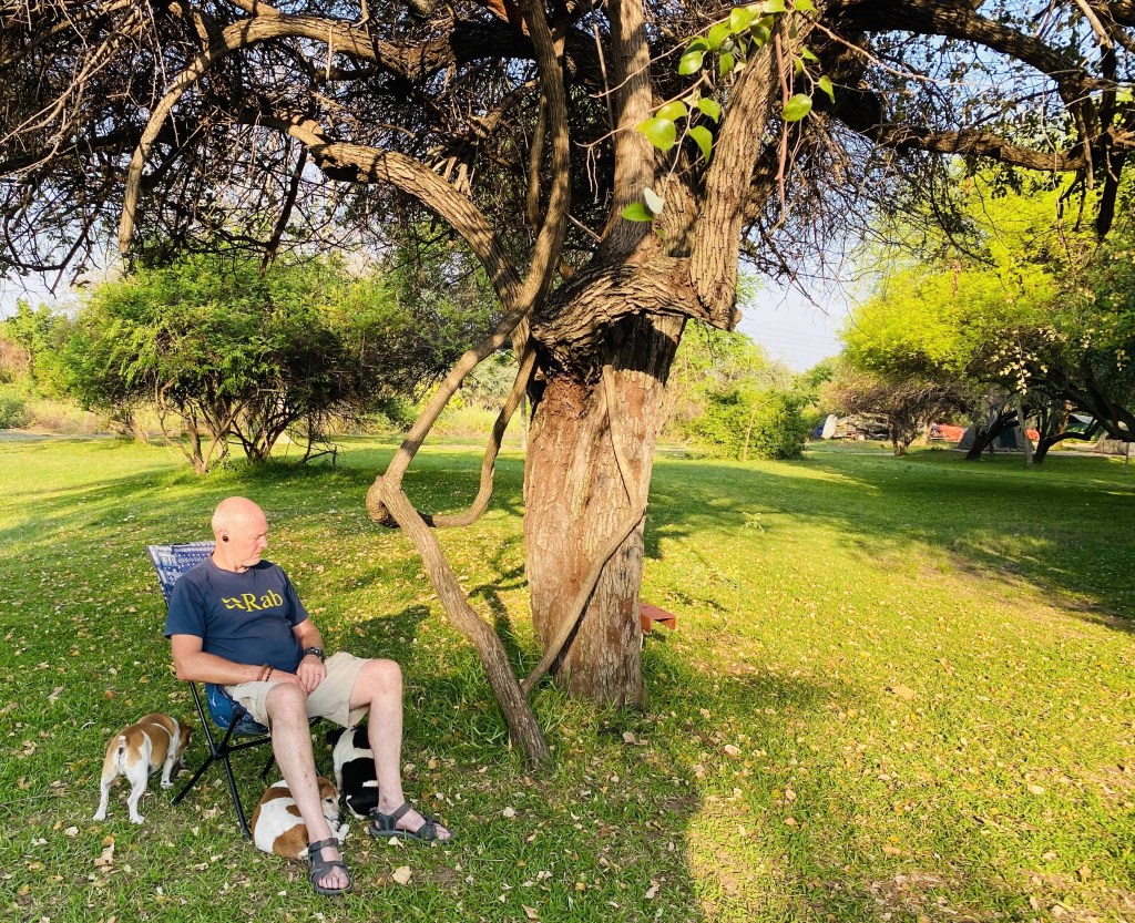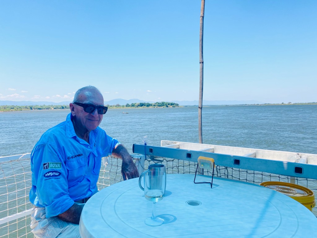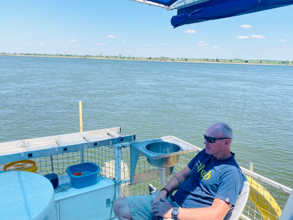 We were enjoying ourselves so much we decided to stay another day. I went up to the bar area to work on the blog and got chatting to a retired Zambian gentleman who lived on a boat moored near the campsite. When James arrived we were both invited for elevenses.
