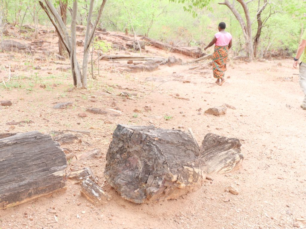 Across the road, skirting the village and along a small footpath – our guide was deftly picking her way along in her bare feet and we did our best to keep up. Eventually we arrived at the site and spent a happy few minutes poking around the huge fossilised trees