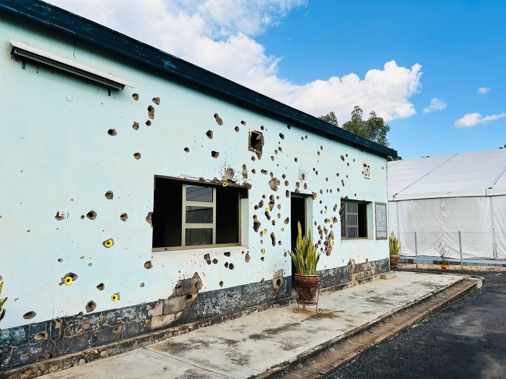 The outside has been kept exactly as it was with bullet holes spattered everywhere