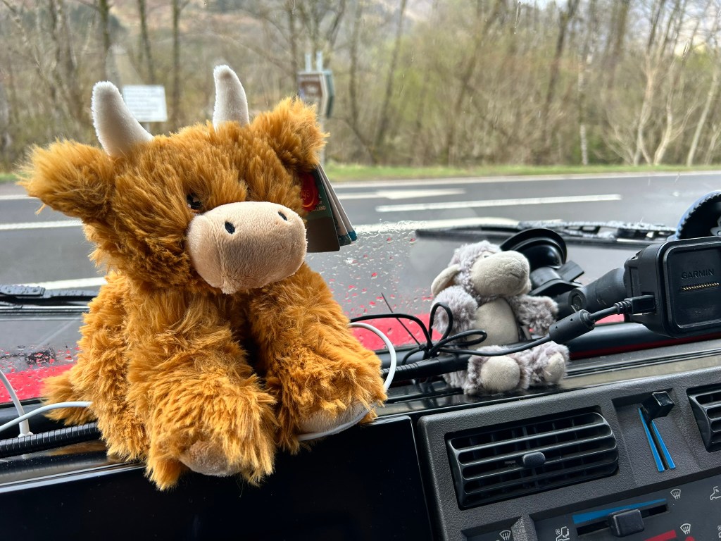 The shop in the visitor’s centre, as every shop in Scotland, sold fluffy Highland Coos. I had resisted buying one on the Britannia in Edinburgh and again at Mount Stuart in Bute. I had decided against the very cute one in the shop at Luss but today I gave in. Meet Dot the Coo – she’ll be keeping Teddy company on the windscreen from now on – supersized truck, supersized mascot!
