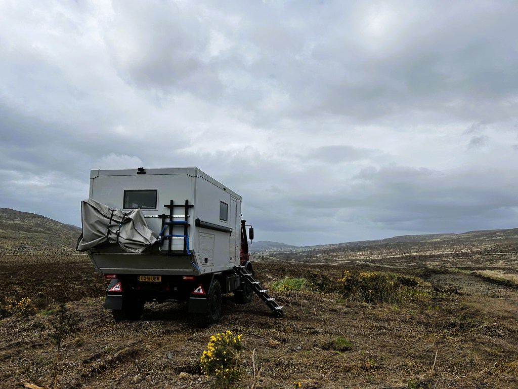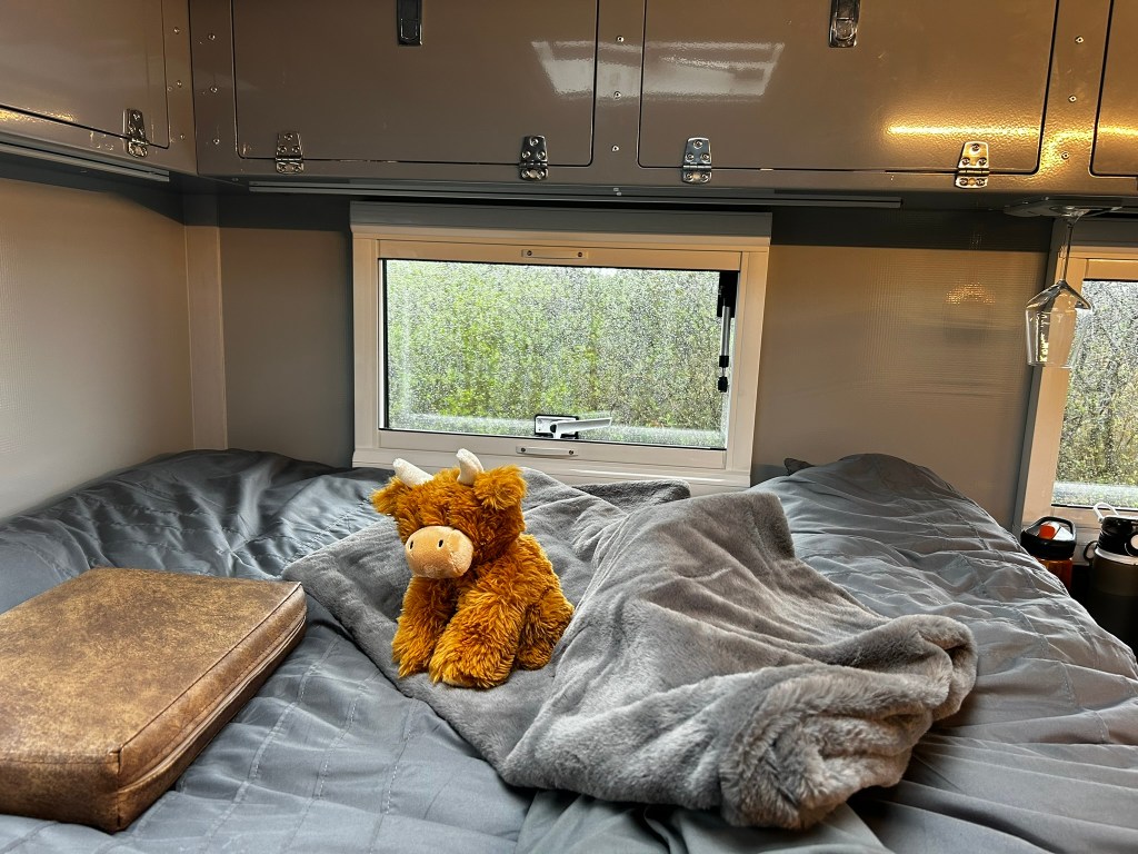 The rain was making it difficult to do much more and it was already mid-afternoon so, after a surprisingly lovely lunch at a community centre, we drove to a wonderful, quiet aire by the Tormore Forest where we parked up for the evening, read for a bit, dozed for a bit and rang my Mum – warm and dry in our cozy little home