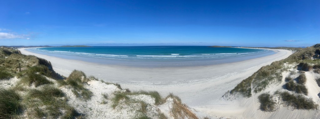 Not so remote that other motorhomes hadn’t found it though! All the spaces were taken up with around eight other campers but after agreeing with everyone that we wouldn’t be in anyone’s way we were able to park-up on the verge overlooking the grassy machair plains