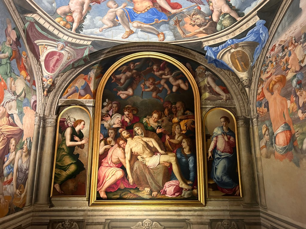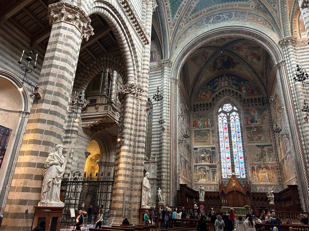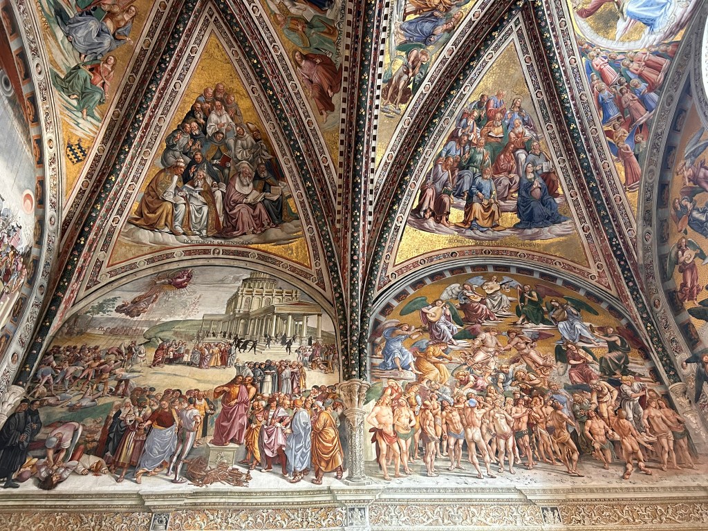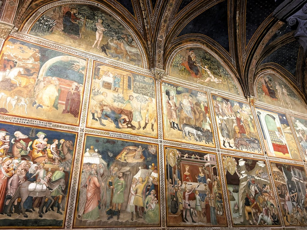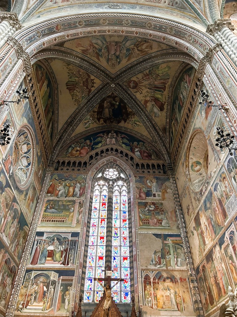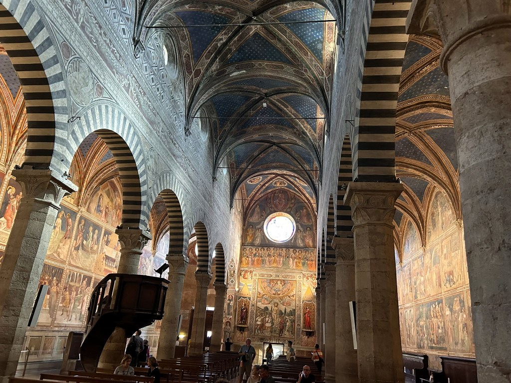 We visited the Duomo which looked quite ordinary from the outside but the inside was amazing. The walls and ceiling were covered in richly decorated 14th century frescoes