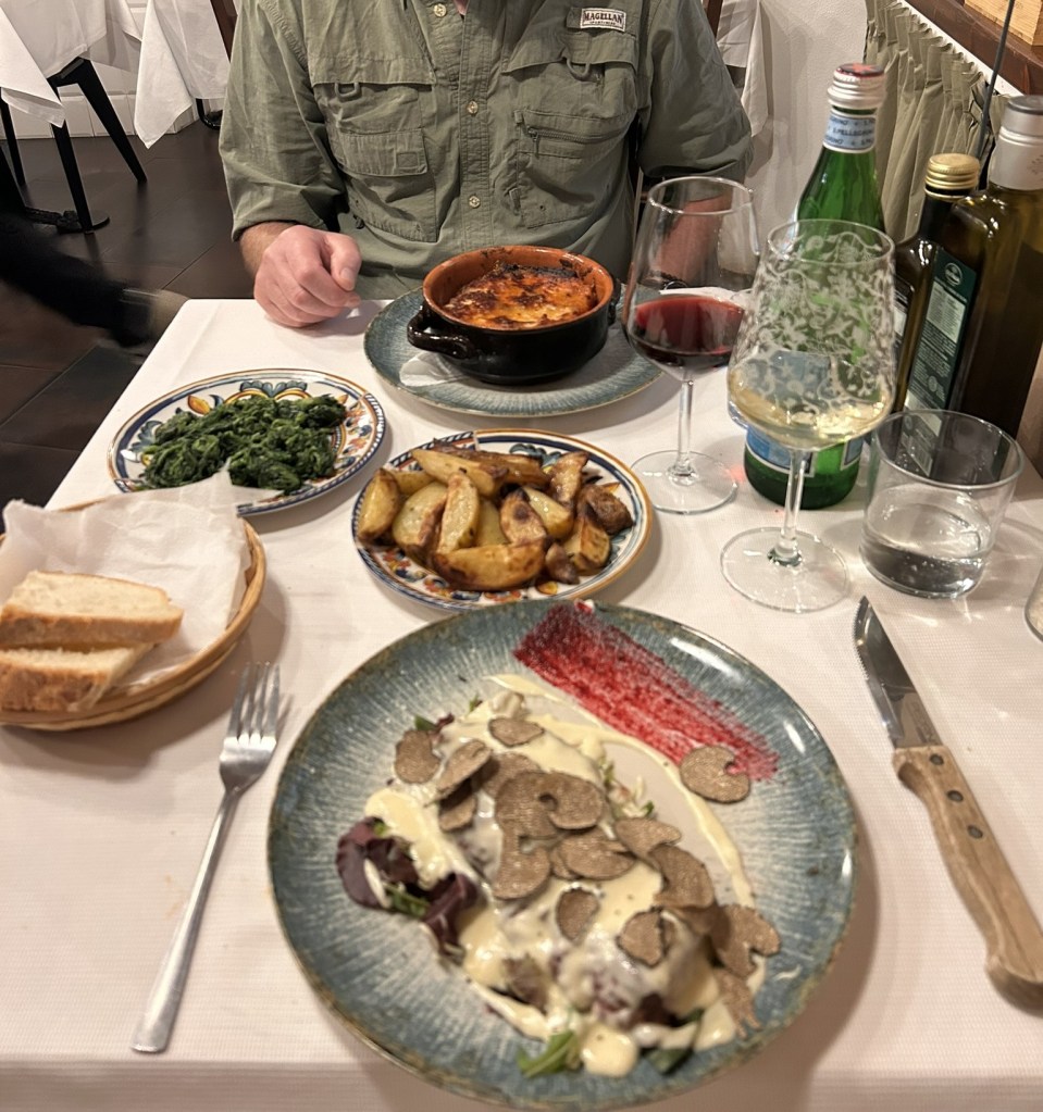 The food was spectacular – probably the best meal I have had in years. I had bruschetta followed by steak with fresh truffles