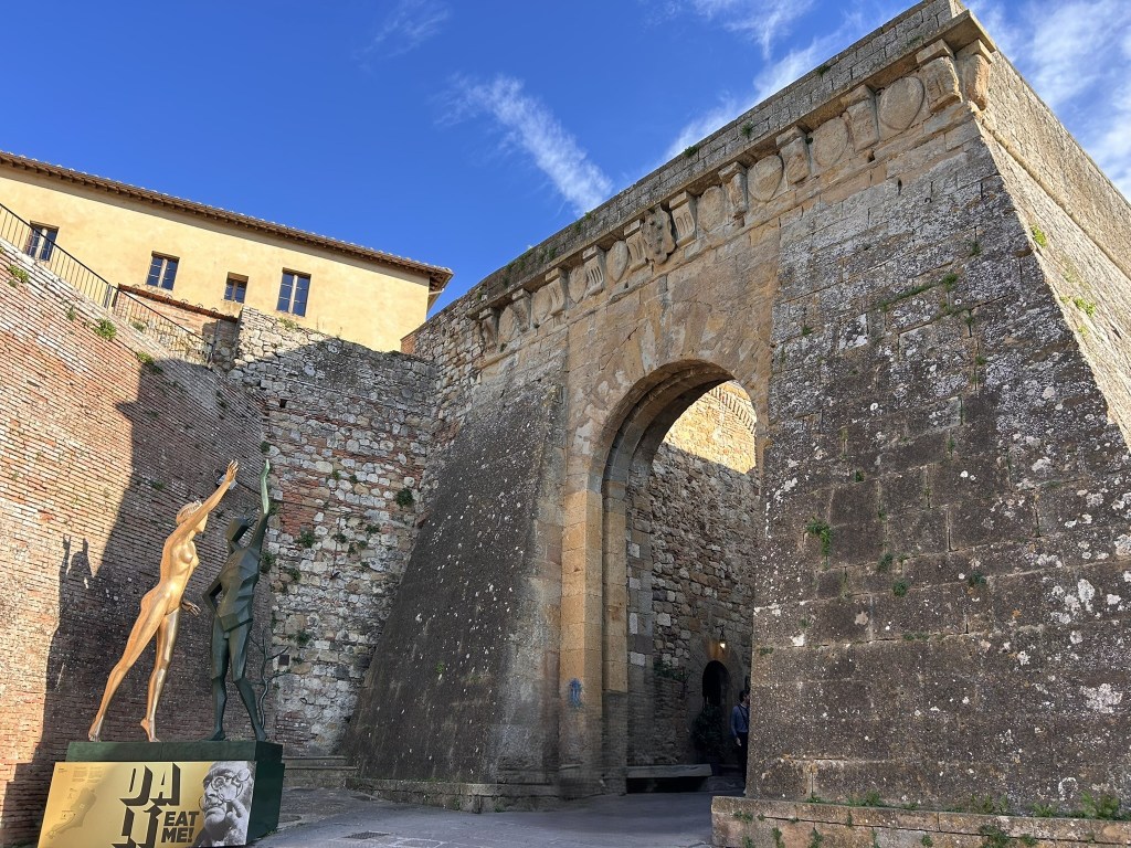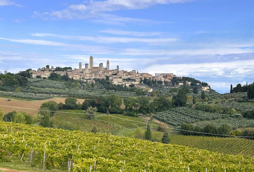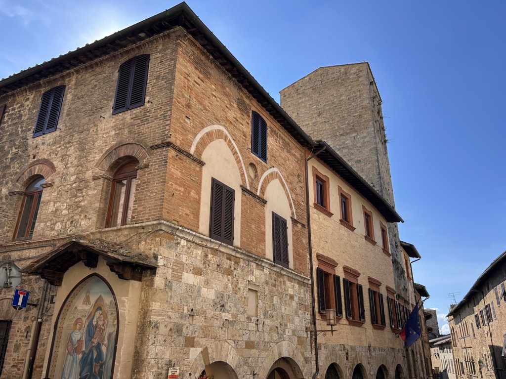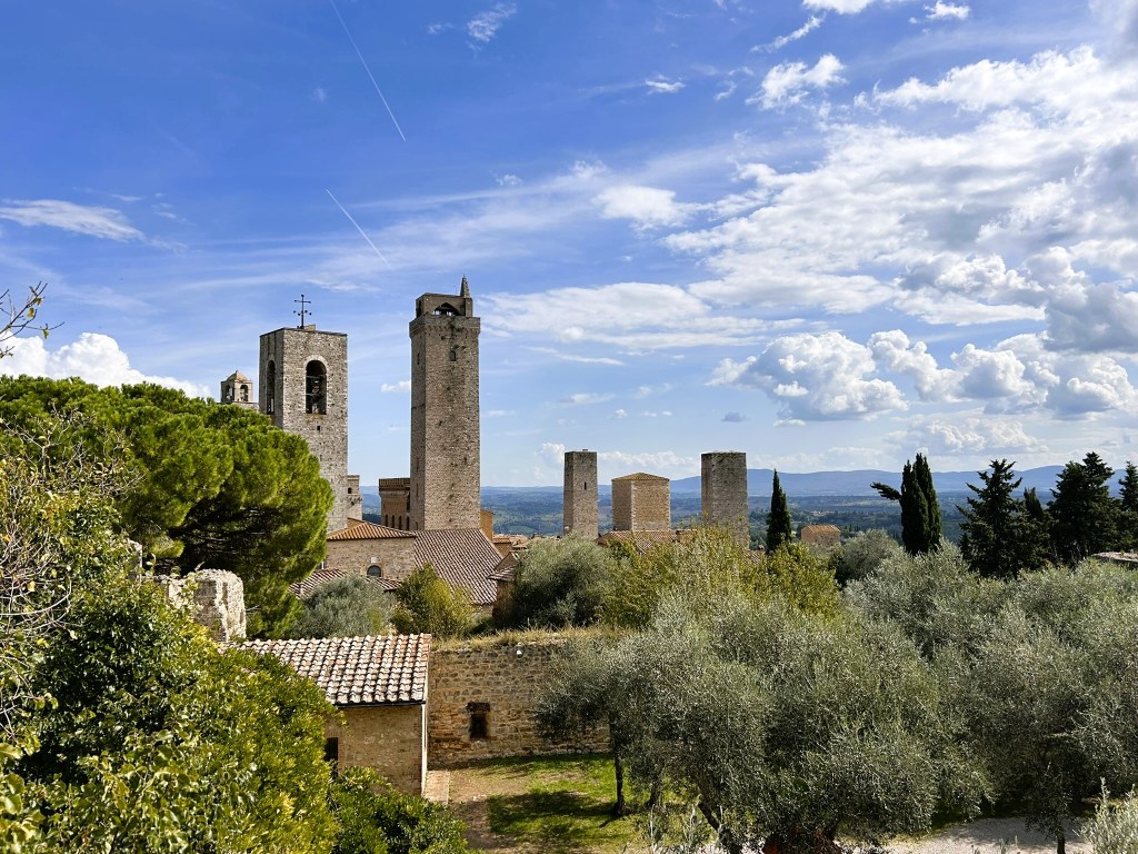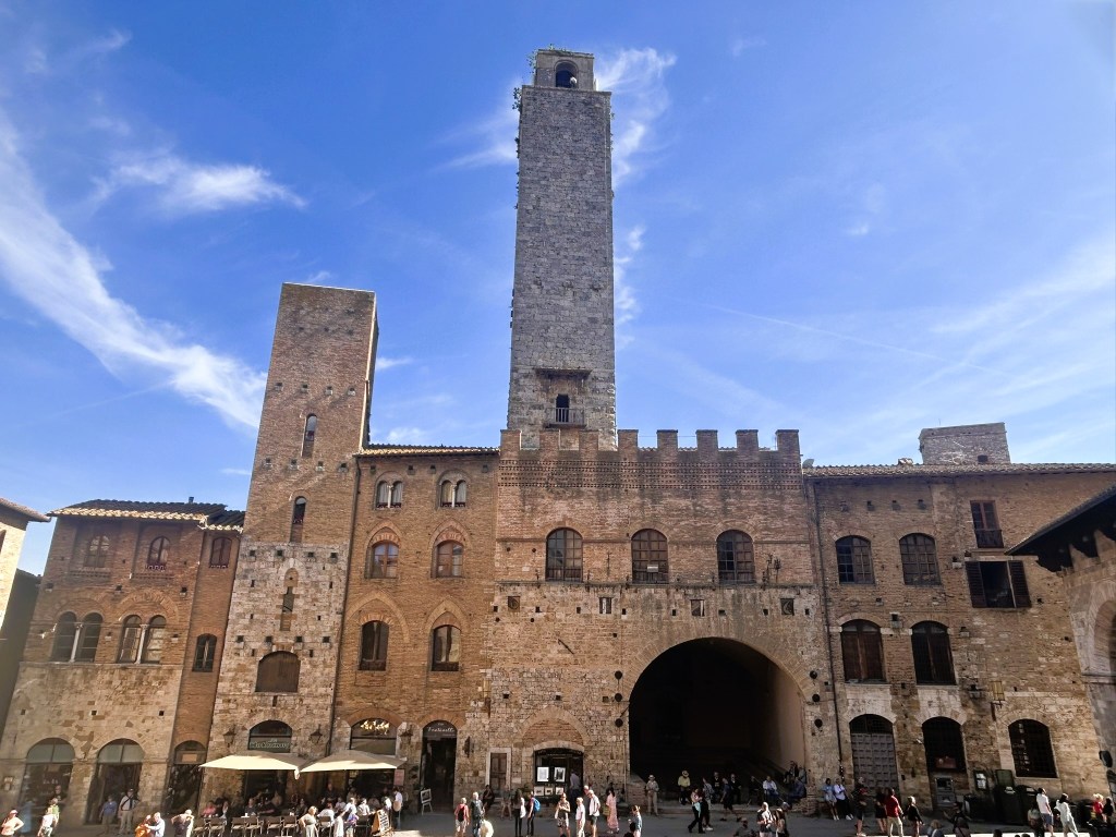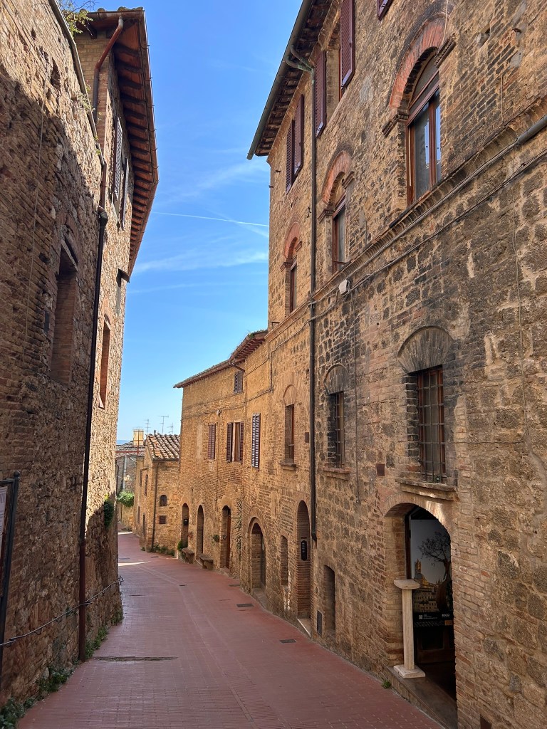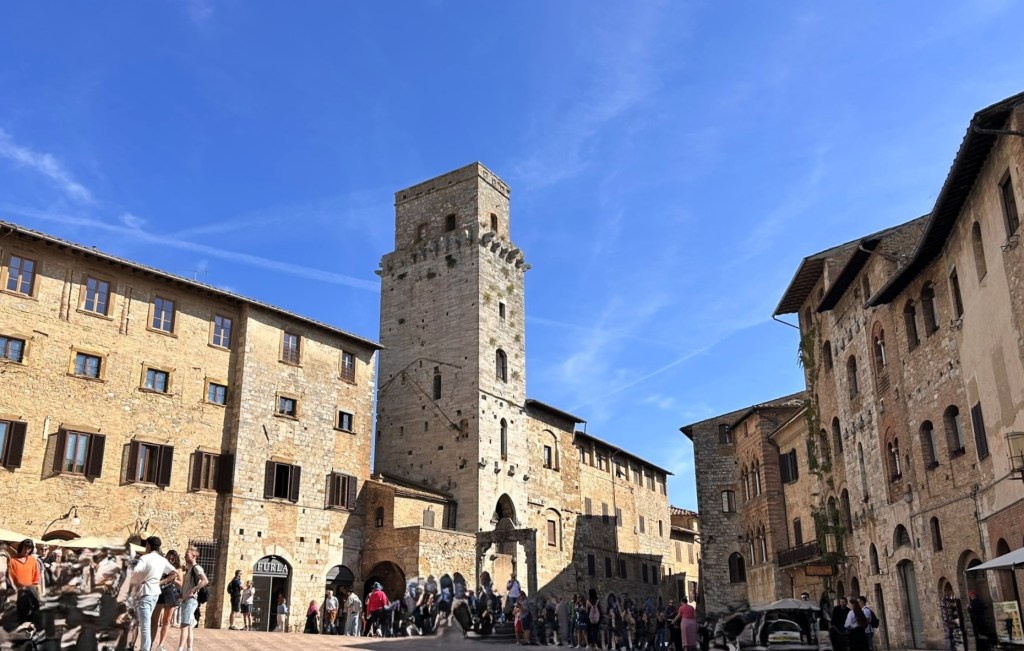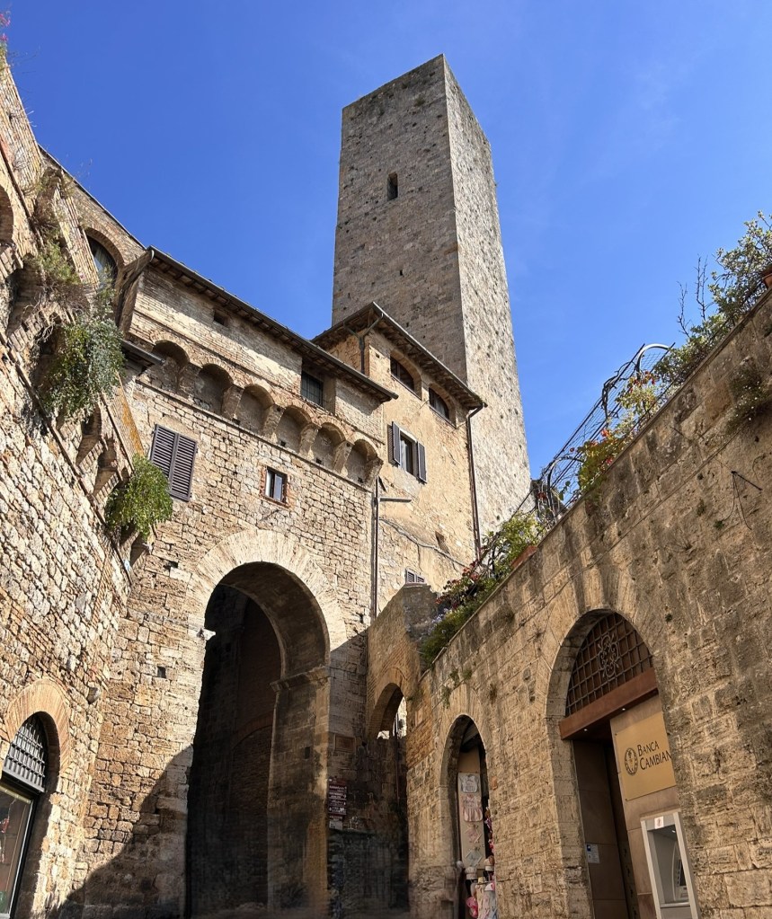 San Gimignano is another of Italy’s lovely, medieval hill towns, this one being famous for its 14 towers. Apparently one of the richest families in the area built a tower as a symbol of their wealth and power, so then another family did the same to keep up with them, then another and so on until there were 14 that created a unique skyline.