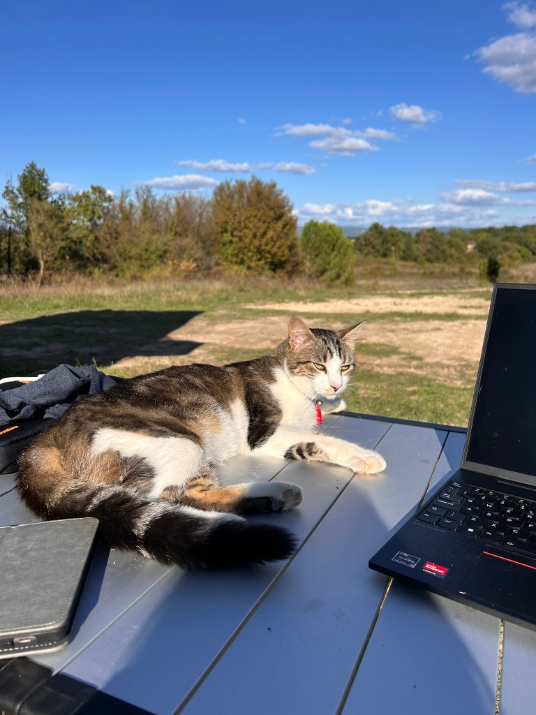 We were joined by two other travellers. The first was a French family of a mother and three adult daughters in a motorhome. But there was more to them than that – they were also travelling with two cats. I have often dreamed of having a travel-cat but never thought it would be practical for all sorts of reasons. These four told me that they had been travelling in their motorhome with their cats for a year without any problems.