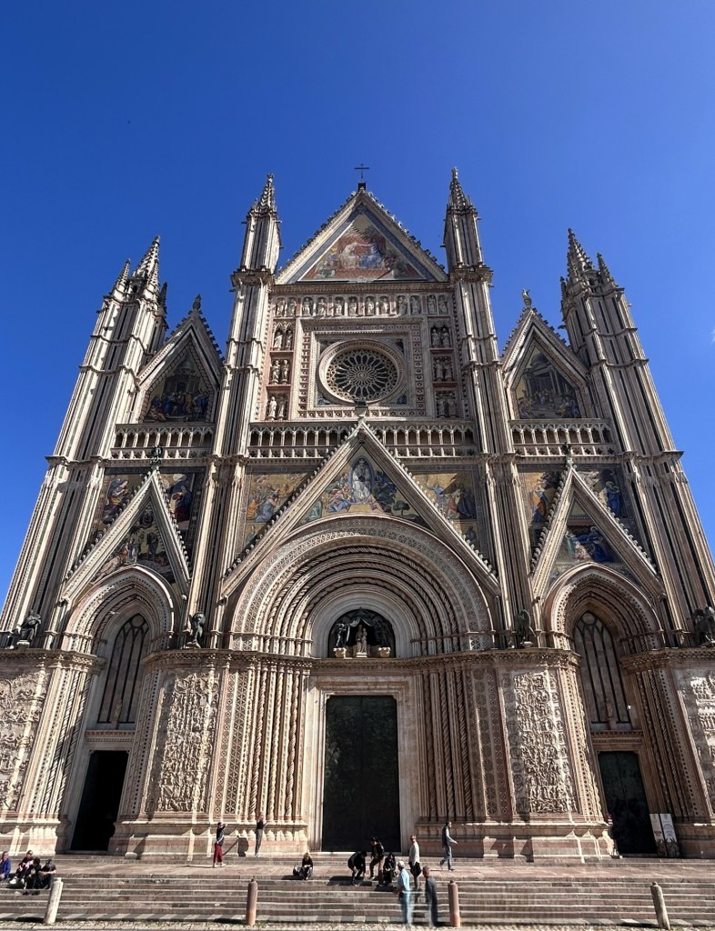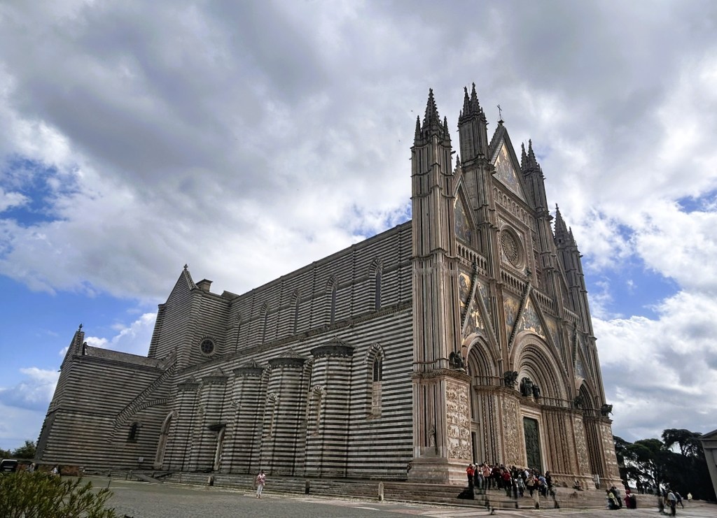 After a good night’s sleep we headed for Orvieta where we wanted to visit the cathedral, known to house some beautiful 14th century frescoes. Despite having found a car park that appeared to be well out of town, we had another nightmare drive getting stuck in the middle of no-traffic zones, 3.5 tonne limits and narrow streets. We tried three different options before eventually finding success in a tiny car park in the next town over. It was so small that we had to park horizontally across four spaces but had pretty much stopped caring by that point.