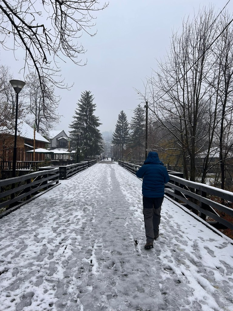 The whole town was much the same. Snow was coming down heavily now, making us cold and wet, and trying to negotiate our way along the pavements was very tricky – we clearly hadn’t found our snow-feet yet