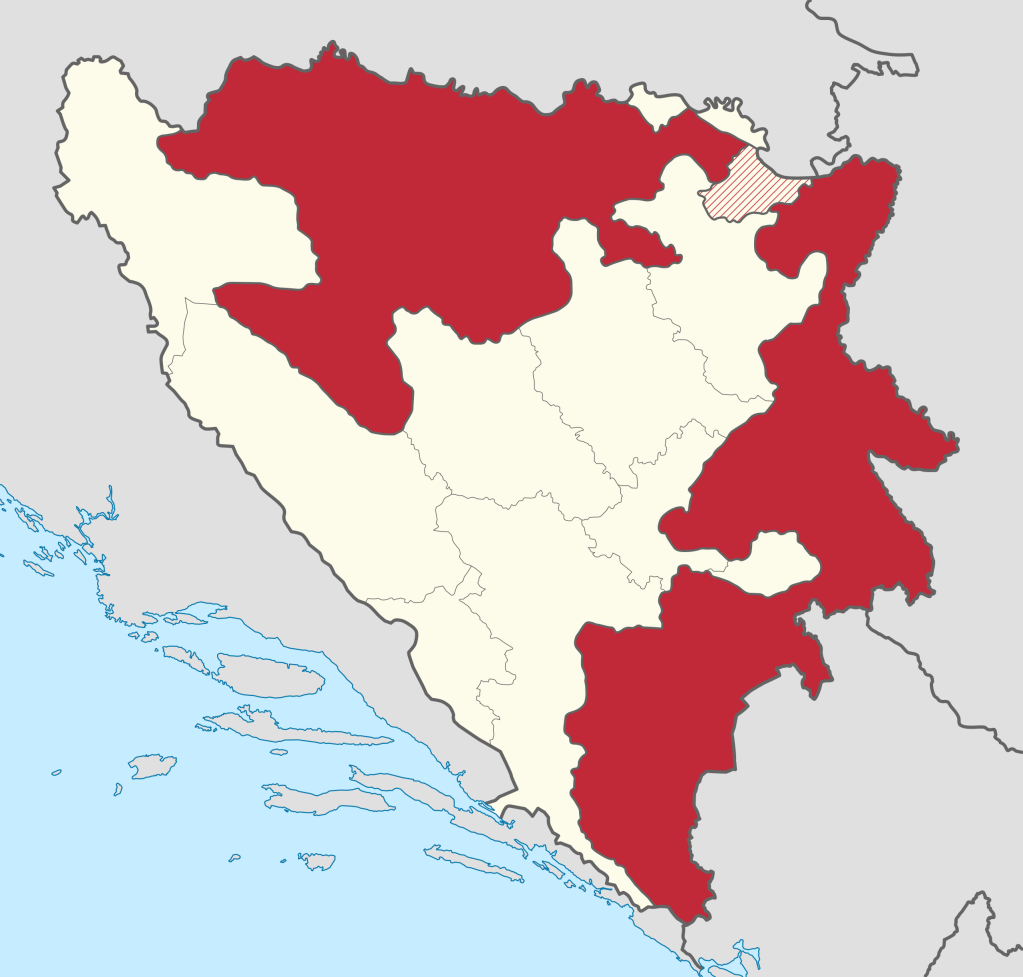 But overlaid on top of that you have the political areas of ‘The Federation of Bosnia and Herzegovina’ (in cream) and the ‘Republic of Srpska’ (in red) otherwise known as the Serb Republic but not to be confused with the country next door which is the Republic of Serbia
