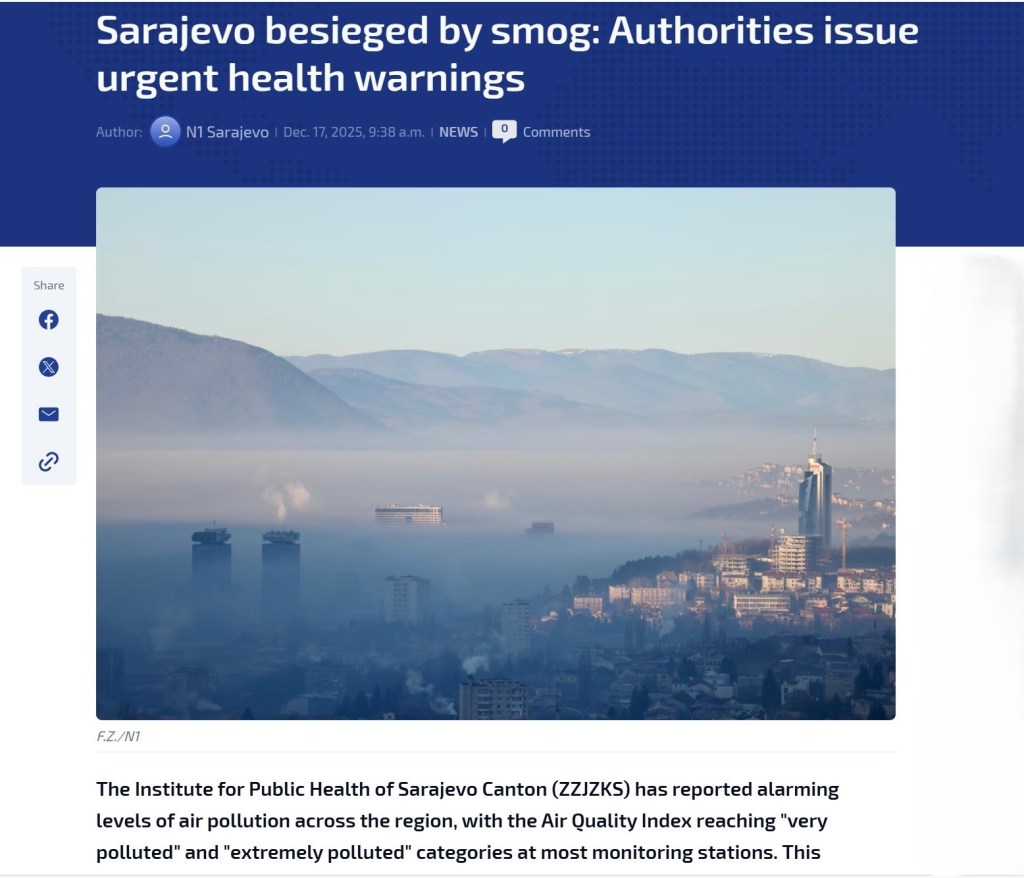 Sarajevo sits in a valley surrounded by hills. These hills hold the air over the city and there is little breeze to blow the pollution away. So an almost permanent blanket of smog sits over it.
