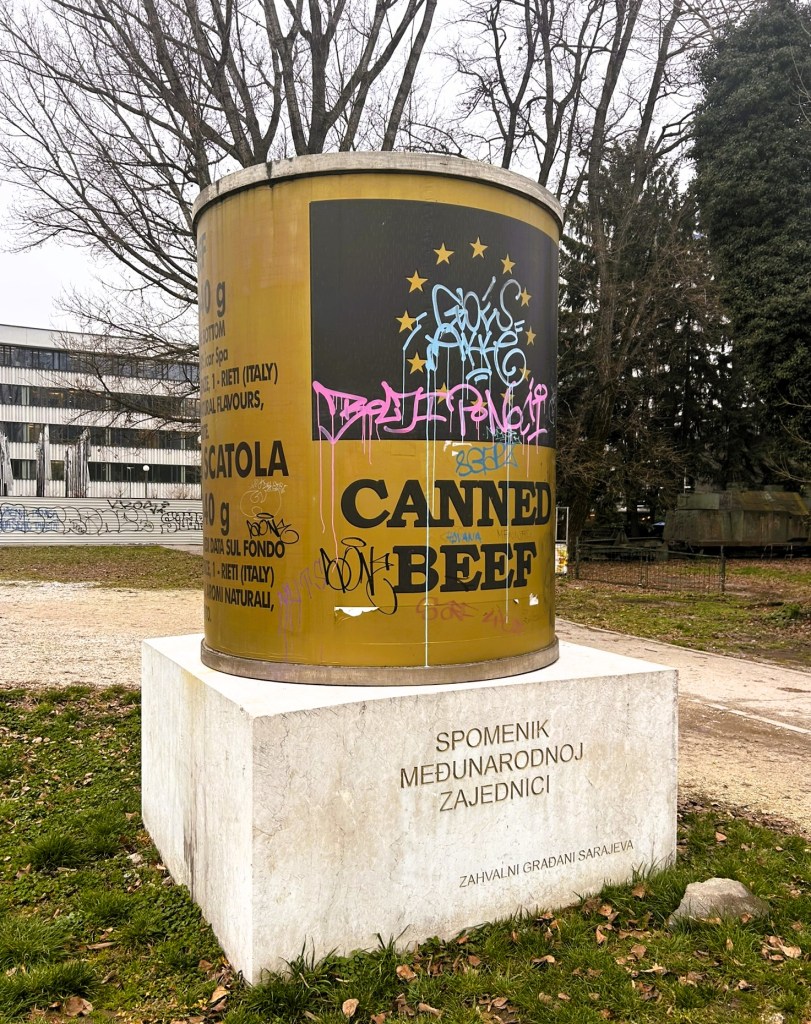 It was covered in graffiti and somewhat uncared for but this seemed to add to the message it was intended to convey – a memorial to the total inadequacy of the international humanitarian aid provided to the city during the siege, including expired and inedible food. As far as tongue-in-cheek memorials go it had to be one of the best.