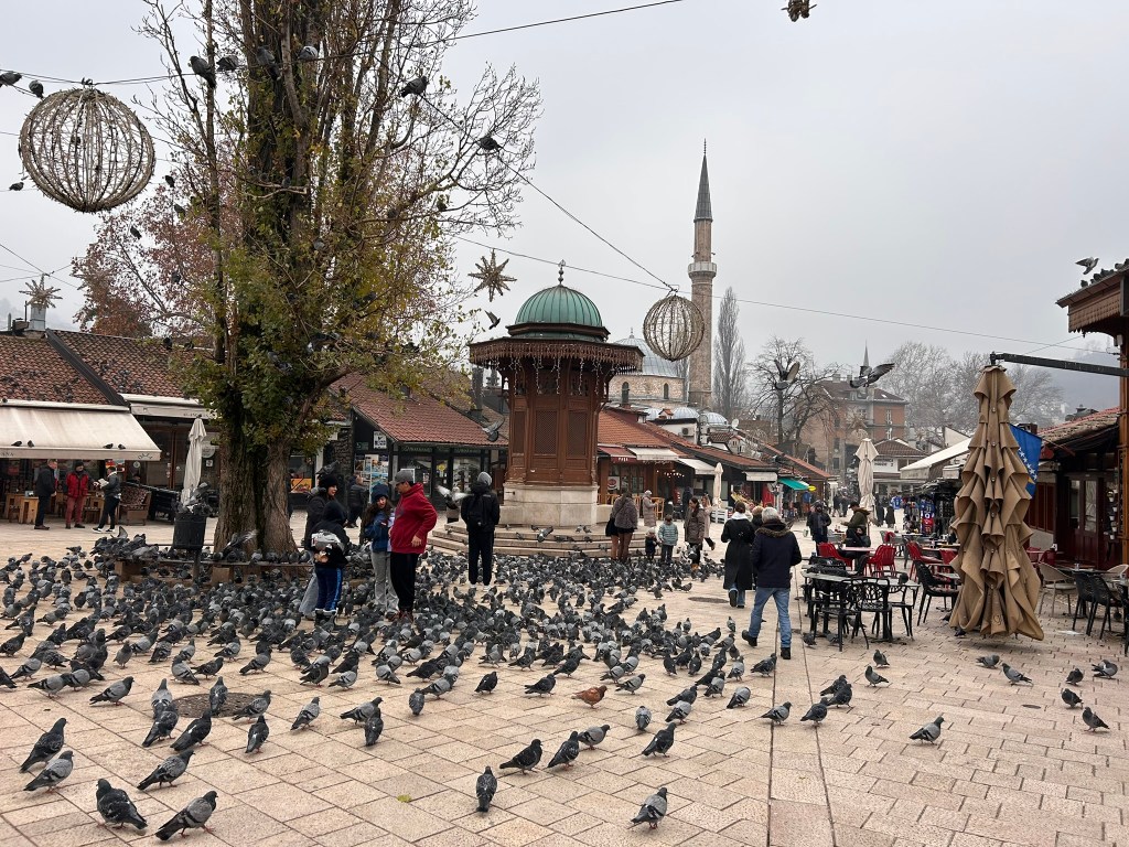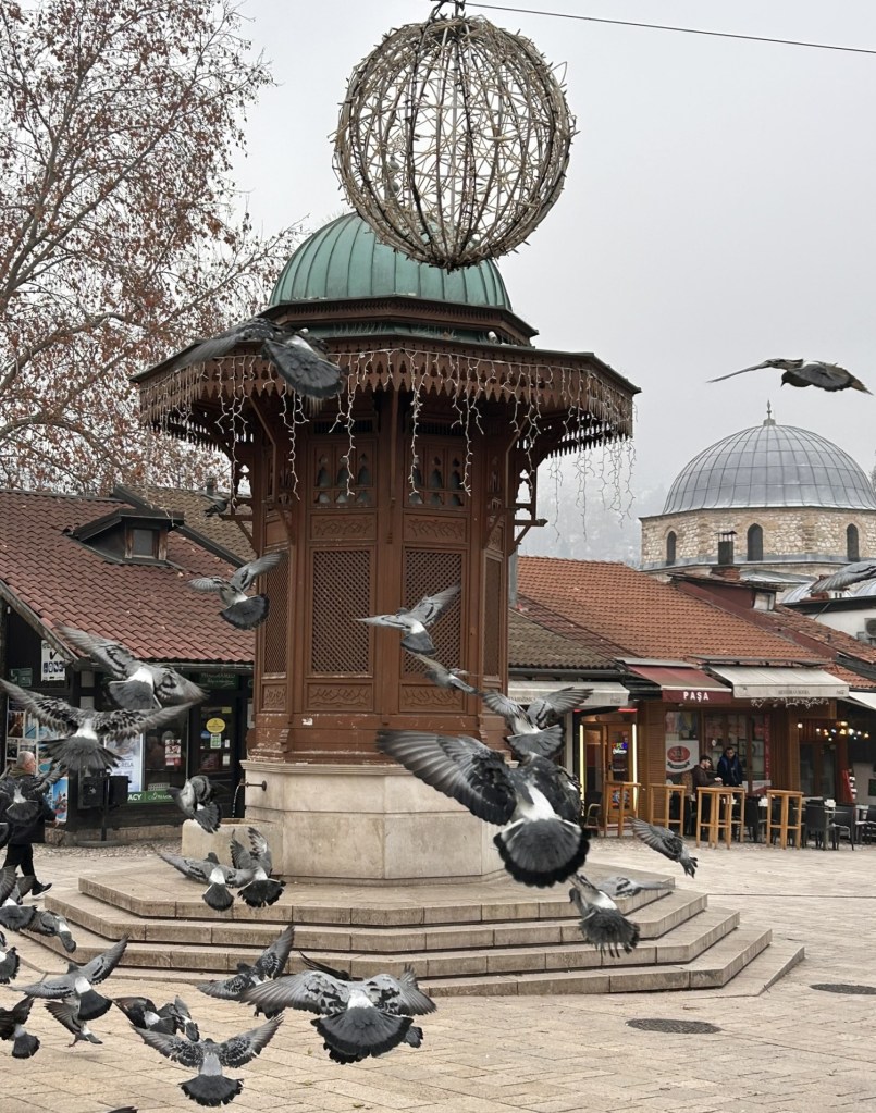 In the middle of the square is the Sebilj, an Ottoman-style wooden fountain