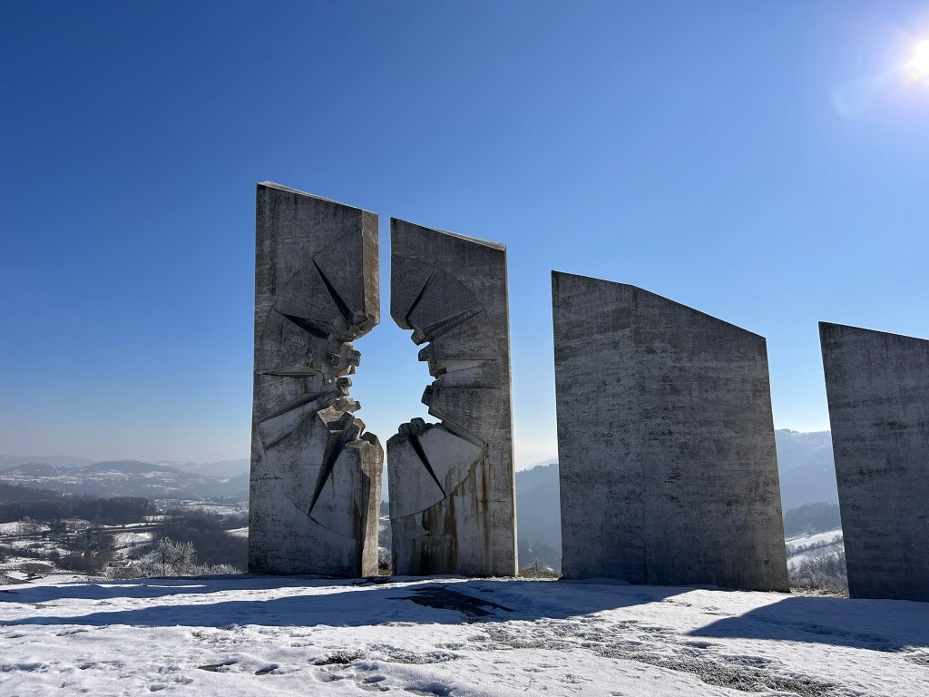 This brutalist memorial is dedicated to the Workers Battalion of Uzice who were killed in the second world war, the stone sculptures representing the advance and ultimate deaths of the soldiers