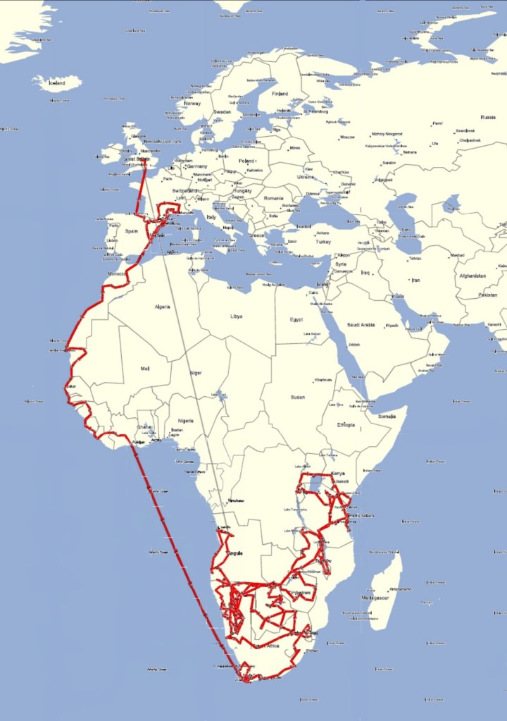 Below is our actual route from the UK across Europe and through Africa, created from our daily satellite pings